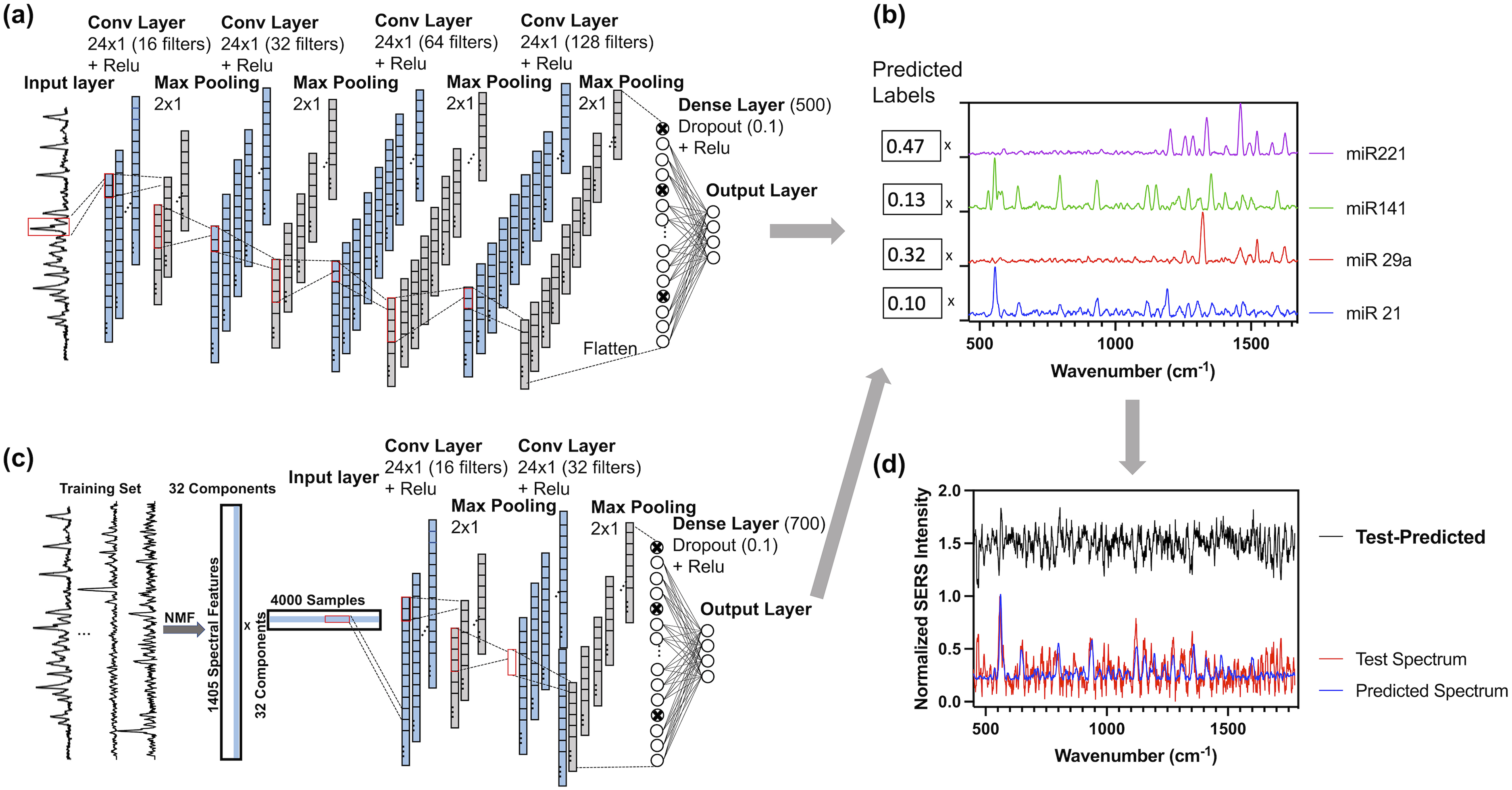 Non-negative matrix factorization (NMF)–CNN has previously been used to analyze SERS spectra with single-molecule resolution. 6 NMF was used to project training spectra into 32 components. Activations were used as input to CNN with 16 kernels in the first convolutional layer with size 24 (Figure 2c). A stride 2 max pooling layer reduced the previous layer's dimensionality. A second convolutional layer was added with 32 kernels of shape 24 with ReLU activation. After another pooling layer, there is a final dense layer with 700 nodes, which then computes the output predictions for each target.