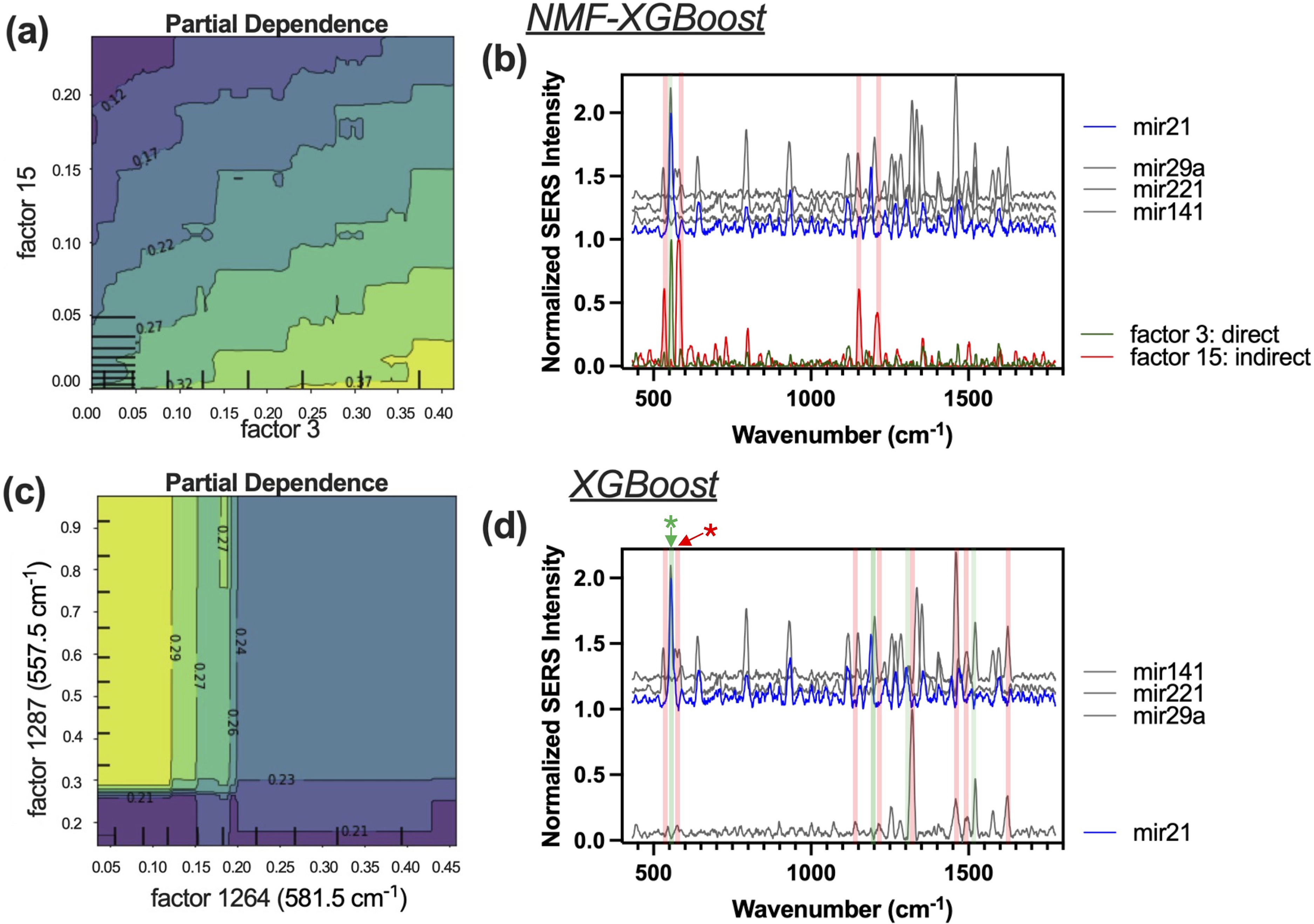 To analyze and visualize the relationship between the miRNA-21 target response and significant features in the XGBoost models, partial dependence plots (PDPs) were generated using Scikit-learn. For the NMF-XGBoost model, a PDP was generated to visualize the interaction between each NMF feature and the miRNA-21 target, one feature with a direct relationship with the target and one feature with an indirect relationship are displayed in Figures 3a and 3b. For the XGBoost model, significant wavelength features were selected based on the PDP range. The two wavelengths with the highest PDP range were plotted in a two-dimensional (2D) PDP contour plot (Figure 3c). All wavelengths with a PDP range >0.01 are shown in Figure 3d.
