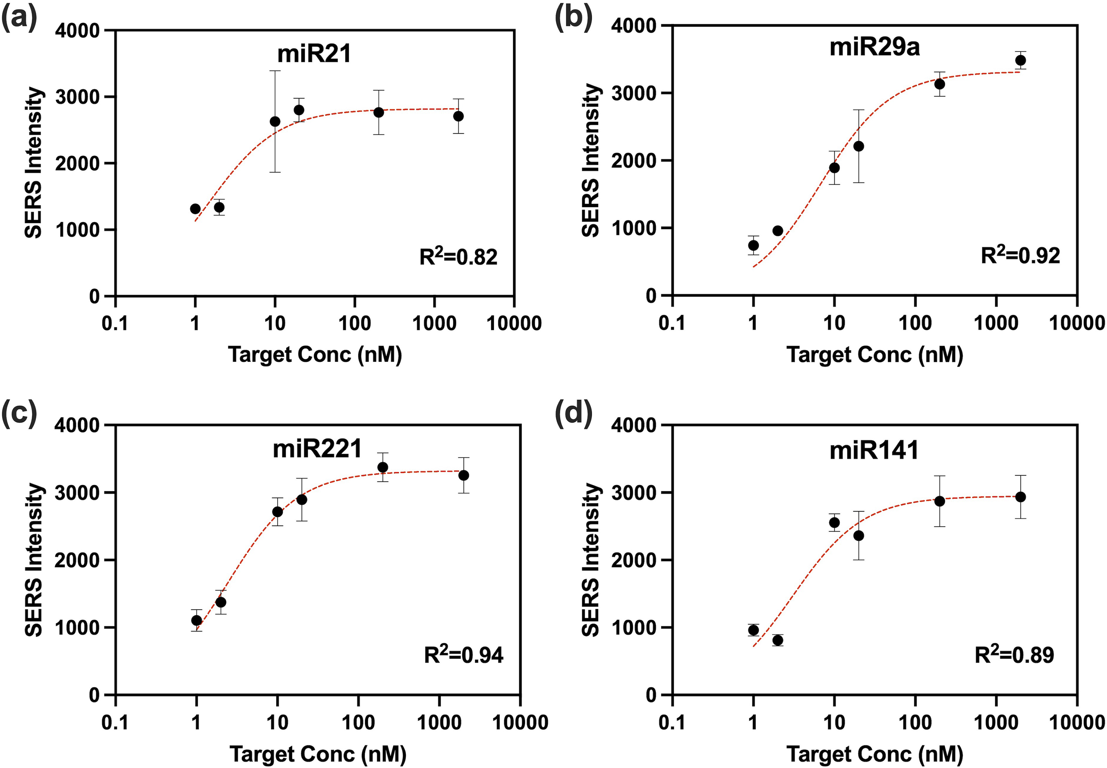 Multiplexed iMS probes for miRNA panel miRNA-21, miRNA-29a, miRNA-221, and miRNA-141 with slight modification as previously described. 13 As seen in Figure 1, the SERS signal is low when the placeholder is bound to the stem-loop and iMS probes are in the “OFF” configuration. The presence of a target miRNA displaces the placeholder and results in a stem-loop formation, bringing the SERS dye label in close proximity to the nanostar and resulting in an increase in the SERS signal when the iMS probes are in the “ON” configuration. SERS-based sensors operate by allowing the substance being measured (analyte) to interact directly with certain areas on the surface of the plasmonic metallic nanoparticle. This creates a response that follows a curve similar to the Langmuir isotherm, with the sensitivity of the sensor becoming very high at the ends of a specific concentration range. The range in which the target can be detected is determined by factors such as the number of particles and the amount of probe strands present. This behavior leads to a nonlinear response in the sensor when the target is present within certain concentration ranges, which has been observed in previous studies. 13 Calibration curves and fit lines for each iMS “flavor” are shown in Figure 4.