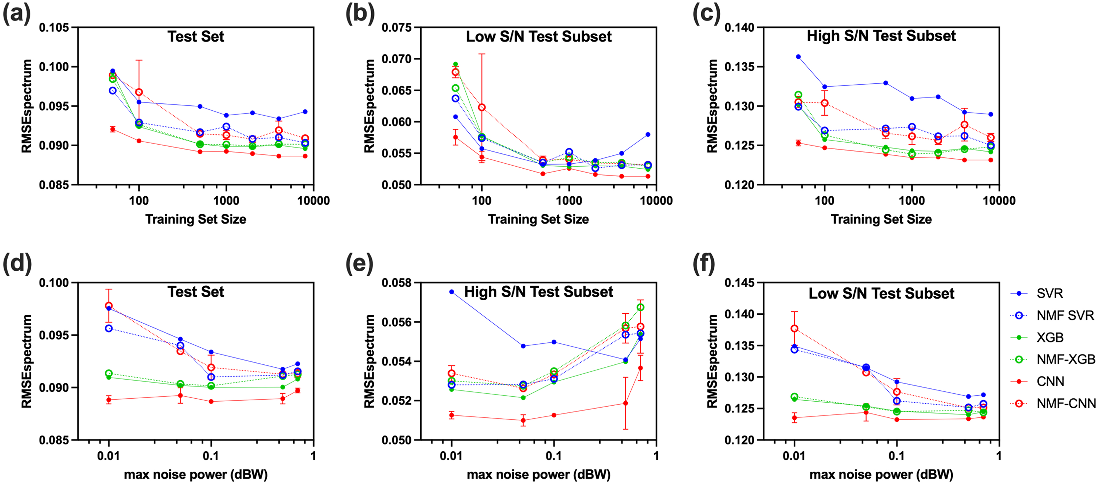In the high S/N test subset, SVR, NMF-SVR, XGBoost, NMF-XGBoost, and NMF-CNN showed a decrease in accuracy with an increase in max noise power, which is expected as lower noise data sets are more representative of the high S/N test subset. On the other hand, in the low S/N test subset, increasing the max noise power generally improved prediction accuracy for the same reason. The effect of noise level on the performance in the overall test set is a combination of these two trends, resulting in a general trend of decreasing then increasing loss as max noise power increases. SVR, NMF-SVR, and NMF-CNN had the strongest dependence on max noise power, with the most rapid decrease in RMSEspectrum as max noise power increased to 0.1 dB. As per previous findings, 27 SVR is prone to overfitting, which is evident in the high S/N subset, where the SVR loss shows an opposite trend of decreasing RMSEspectrum with increasing max noise power in the range [0.01–0.5]. This is because increasing the added noise in the training set decreases overfitting in SVR, resulting in better performance. On the other hand, NMF-SVR displayed the opposite trend to SVR in the high S/N subset, where lower max noise added resulted in more accurate predictions, indicating that adding dimensionality reduction before SVR reduced overfitting.