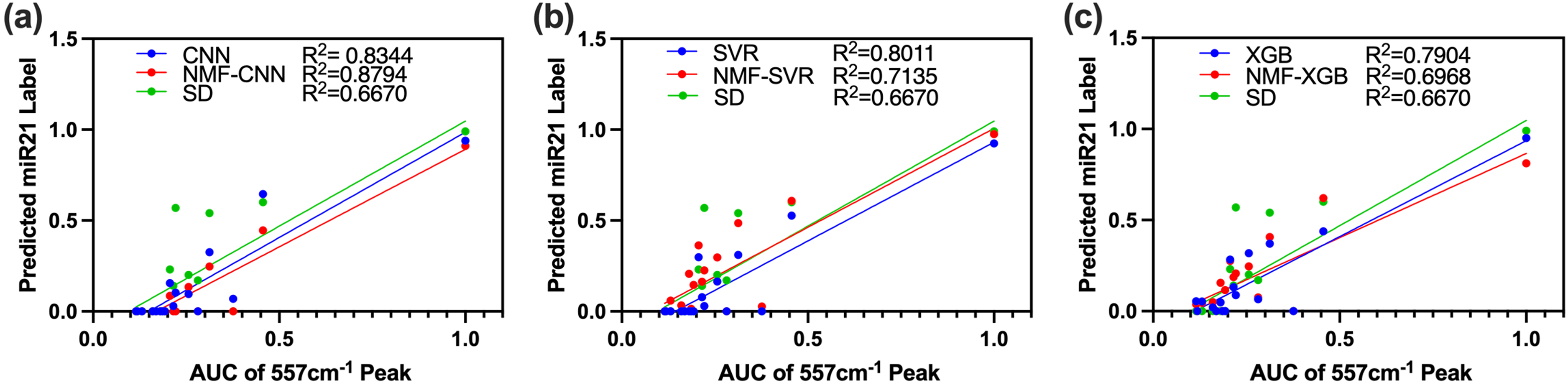 Clinical spectra were previously evaluated by the (AUC of the 557 cm–1 main peak for miRNA-21-Cy5. Thus, model predictions were correlated with AUC. NMF-CNN and CNN achieved the highest