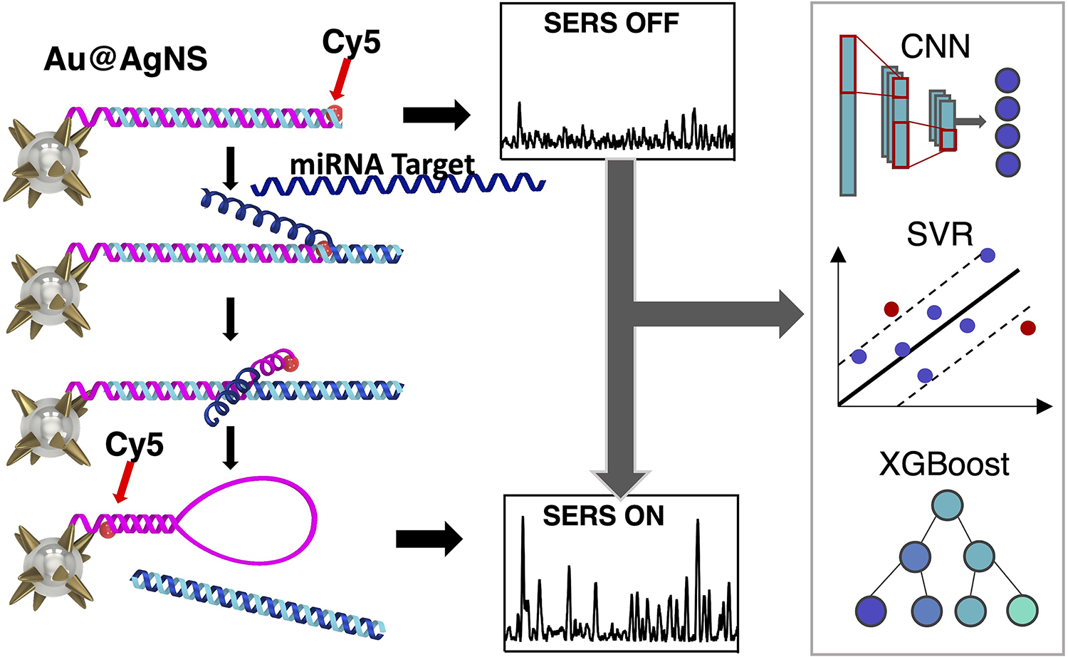 Due to its distinct advantages, SERS represents a promising tool for molecular diagnostics. Over three decades, our laboratory has developed various SERS substrates and detection techniques ranging from chemical sensing7–9 to molecular diagnostics.10–14 The need for accessible strategies for early cancer diagnosis is critical, and nucleic acid-based molecular diagnostics, particularly micro-RNAs (miRNAs), show promise as biomarkers for early detection of various diseases including cancers, 15 such as esophageal adenocarcinoma 16 and colorectal cancer (CRC), 17 cardiovascular disease, 18 and neurogenerative diseases. 19 These cancers have unique biomarker profiles, including miRNA-21, that can be detected in tissue and peripheral blood, but challenges with detection have prevented implementation in early diagnostics due to the need for specialized equipment and time-consuming processes. Despite recent developments in molecular diagnostics, there remains a gap between their advancement and their implementation in clinical settings. SERS-based diagnostic developments may help close the gap due to their high diagnostic accuracy and capability for multiplexed sensing. 20