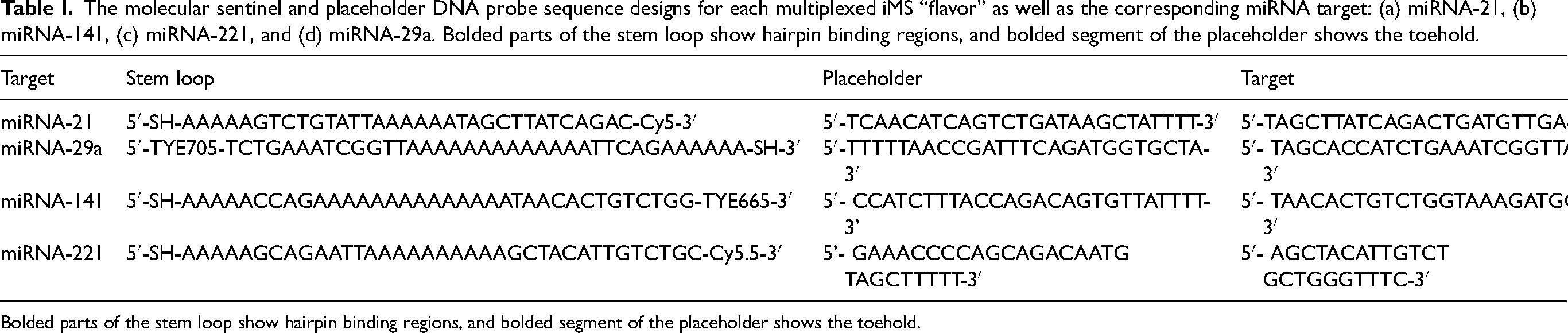 Inverse molecular sentinel (iMS) probes were designed using DINAMelt to simulate nucleic acid hybridizations and calculate melting temperatures. Four distinct sets or “flavors” of probes were designed for the detection of miRNA-21, miRNA-29a, miRNA-141, and miRNA-221. The sequences for the stem-loop and the placeholder were chosen to maximize the sensitivity by optimizing the melting temperatures of the probe–placeholder and placeholder–target hybrid complexes. The stem-loop and placeholder sequences were designed as shown in Table I. The stem-loop sequences for targets miRNA-21, miRNA-141, and miRNA-221 contain a 5′-thiol modifier and 3′ Raman dye. Due to the availability of dye conjugations for TYE705, the stem-loop contained a 5′ Raman dye and 3′-thiol modifier. The thiol termination allows for binding of the 5′ or 3′ end of the nanoparticle surface, respectively. The synthetic DNA targets are also shown in Table I.