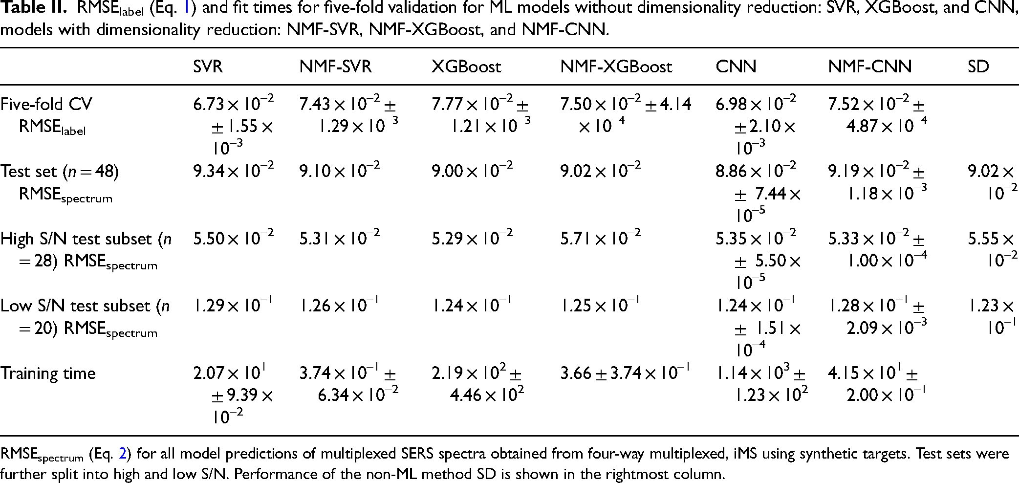 Overall, NMF dimensionality reduction reduces model complexity and can prevent overfitting for complex ML models at the expense of some information loss. NMF can be used with a variety of ML models. Here we investigated SVR, XGBoost, and CNN (Table IV). SVR performed well in five-fold CV but did not generalize to experimentally acquired multiplexed spectra due to overfitting. XGBoost performed relatively accurately and can be more interpretable than CNN but cannot outperform CNN because it cannot retain spatial relationships. Finally, CNN achieves the highest accuracy predictions due to its convolutional nature but requires the most memory, computing power, and training times. It is important to choose the model based on the application.