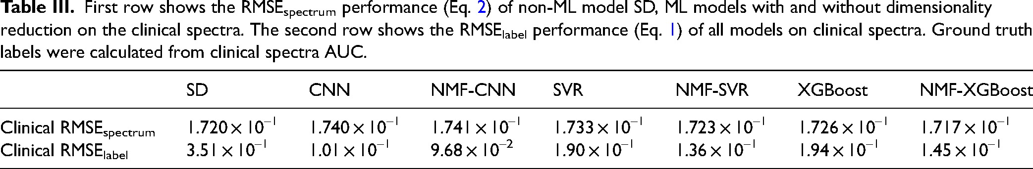 First row shows the RMSEspectrum performance (Eq. 2) of non-ML model SD, ML models with and without dimensionality reduction on the clinical spectra. The second row shows the RMSElabel performance (Eq. 1) of all models on clinical spectra. Ground truth labels were calculated from clinical spectra AUC.