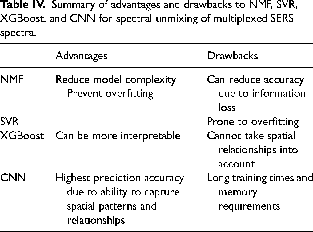 Summary of advantages and drawbacks to NMF, SVR, XGBoost, and CNN for spectral unmixing of multiplexed SERS spectra.
