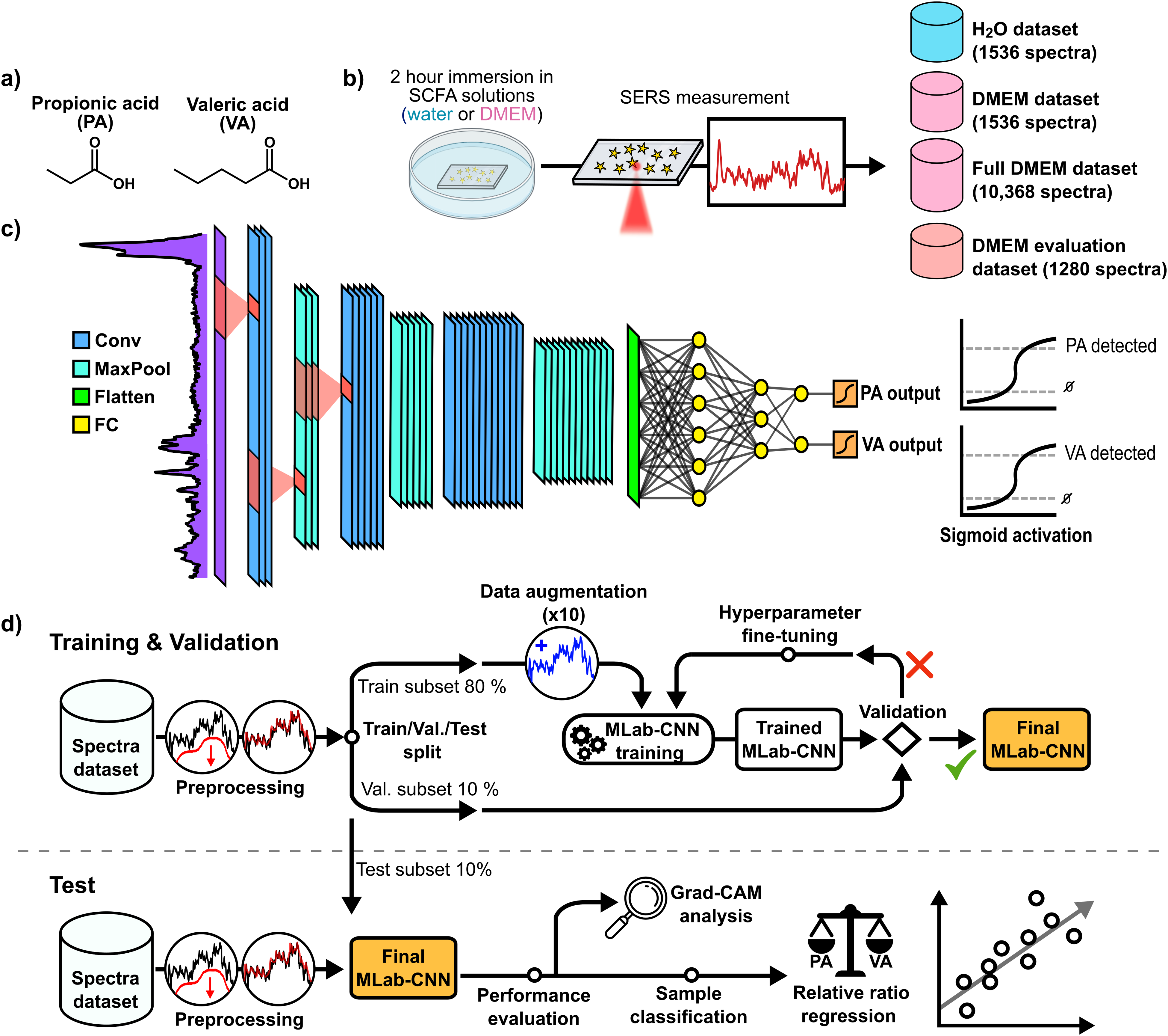 Experimental method used to perform the detection of SCFAs in SERS with deep learning. (a) Molecular structure of SCFAs propionic acid (PA) and valeric acid (VA). (b) Schematic summarizing the collection of SERS spectra datasets. (c) Architecture of the multi-label CNN used for detection of SCFAs. (d) Complete procedure to perform simultaneous multi-label deep learning-based detection of both SCFAs.