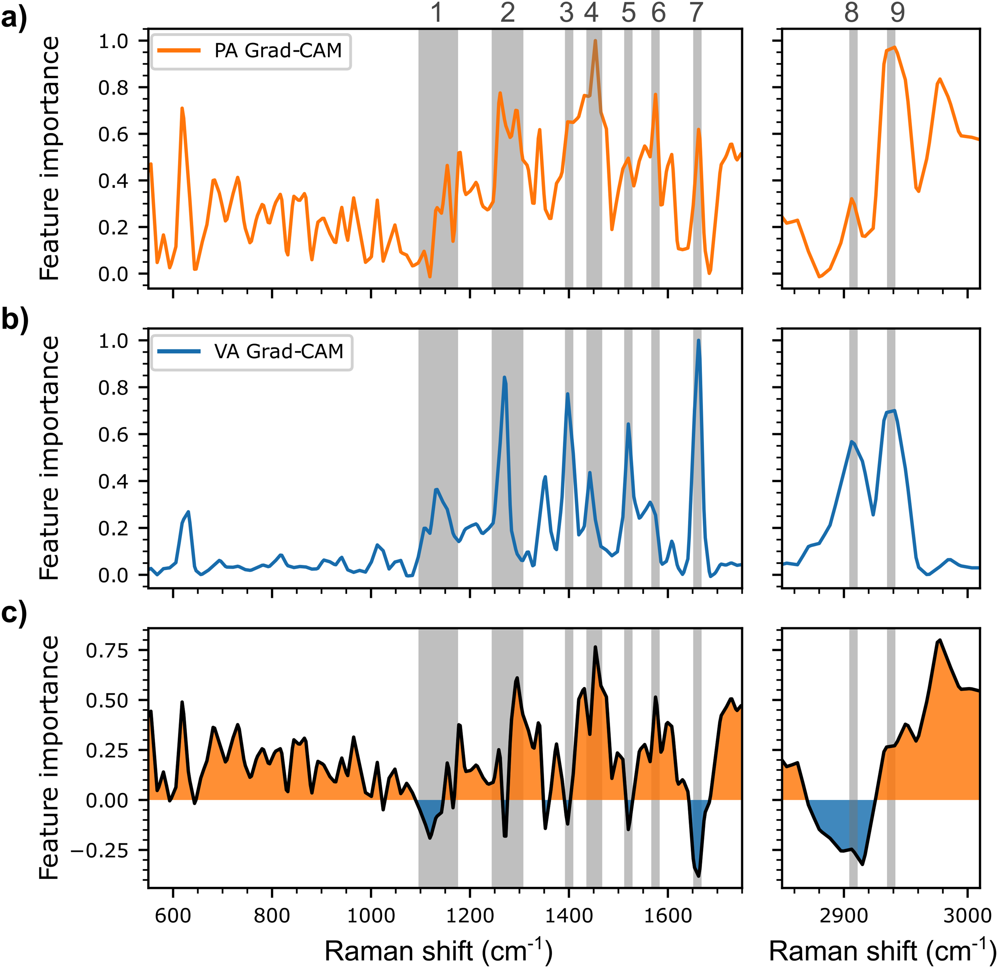Spectrally distributed importance in the decision process of the multi-label CNN model, as determined using the GradCAM method, for the test spectra of (a) propionic acid (PA, in orange) and those of (b) valeric acid (VA, in blue). (c) GradCAM difference between PA and VA (PA minus VA) with the comparatively more important regions for PA (>0) in orange, and the comparatively more important regions for VA (< 0) in blue. Selected spectral bands or regions referenced in the analysis in the paper are highlighted with the light gray bands.