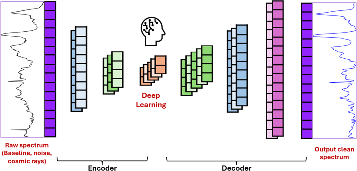 Raman spectroscopy (RS) is a label-free, non-destructive optical modality that provides a detailed profile of the molecular composition of a sample. There is growing interest in the clinical application of RS to characterize biomolecular signatures associated with radiotherapy response in tumor cells and tissues. A critical step before analyzing Raman data consists of performing spectral pre-processing to increase the quality of the measurements. Spectral pre-processing comprises baseline subtraction, signal smoothing, cosmic ray (CR) correction, and removal of poor-quality measurements. Herein, we present a convolutional autoencoder (AE) for single-step, automated pre-processing of Raman spectra obtained from tumor cells and tumor tissue. We trained two separate models using the same proposed architecture, one for eliminating spectral artifacts from preclinical single-cell line and xenografted tissue spectra exposed to single-fraction radiation, and the other for correcting clinical prostate tumor biopsy spectra collected from patients receiving high-dose-rate brachytherapy (HDR-BT). The autoencoder demonstrated fast, excellent performance in removing baseline, noise, and CRs. For the preclinical data, the model obtained a root mean squared error (RMSE), and a percentage root mean squared difference (PRD) of 7.1 × 10−5 and 3.1%, respectively, between the AE-corrected spectra and their corresponding target data (pre-processed by our current baseline-removal algorithm). Also, the autoencoder successfully removed 94.0% of CRs from the spectra. For the clinical biopsy data, the AE achieved an RMSE and a PRD of 8.1 × 10−5 and 3.7%, respectively, and a CR removal rate of 90.2%. Overall, the AE corrected approximately 11 000 spectra within 2.4 s without the need of a GPU. Furthermore, comparative supervised learning-based post-processing data analyses were performed separately on the spectra pre-processed by the autoencoder versus the target data, and we show consistency in the biochemical radiation response profiles extracted. Finally, the AE architecture was leveraged to train a reconstruction AE to facilitate semi-automated identification of poor-quality prostate biopsy spectra, and we demonstrate 96.4% agreement between AE and manually removed outliers. These results support the development of a deep learning framework for efficient, automated pre-processing of tumor cell and tissue Raman spectra collected for radiation response monitoring studies.