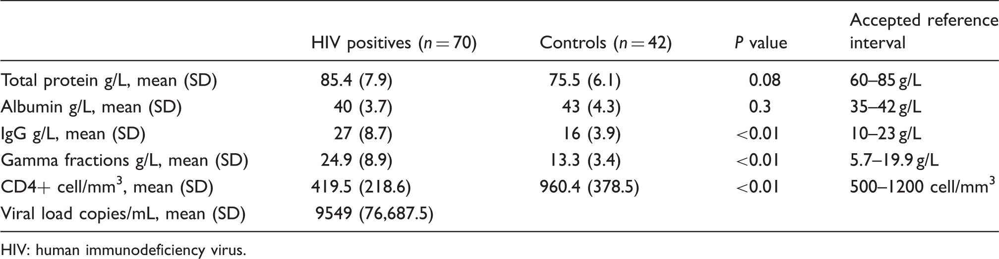 Serum protein electrophoresis was performed on 70 HIV-positive, clinically well treatment-naïve subjects and 42 HIV-negative controls and correlated with markers of disease severity, namely CD4+ counts, viral loads, IgG and albumin.