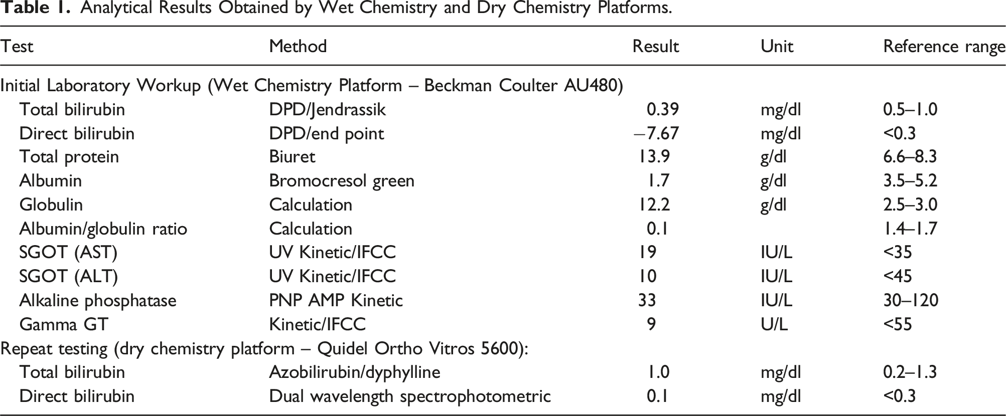 To resolve the diagnostic uncertainty in this patient, bilirubin estimation was repeated using a dry chemistry platform. Dry chemistry makes use of multilayer slides with specific functional layers. The filter and spreading layers serve as membranes that divide large interfering proteins from the reagent zone and permit only the analyte of interest to react in the detection layer. 7 Dry chemistry platform gave bilirubin values consistent with the clinical presentation, thus verifying both the analytical interference in wet chemistry and the accuracy of dry chemistry in such contexts.