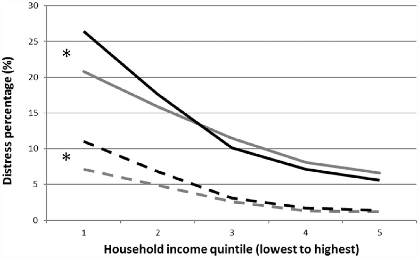 High/Very-high distress was associated with income in both countries, significantly affecting more people in the poorest household income quintile (21–27%) compared to richest (5–6%); see Figure 1. After adjusting for effects of age and gender, OR for