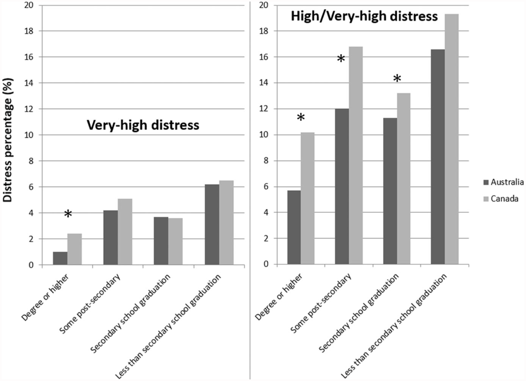 Percentage of psychological distress by education level in Canada and Australia (ages 20–64 years). Very-high distress (left-hand panel) and combined high and very-high distress (right-hand panel) are shown. The 95% confidence intervals are given in Table 1.