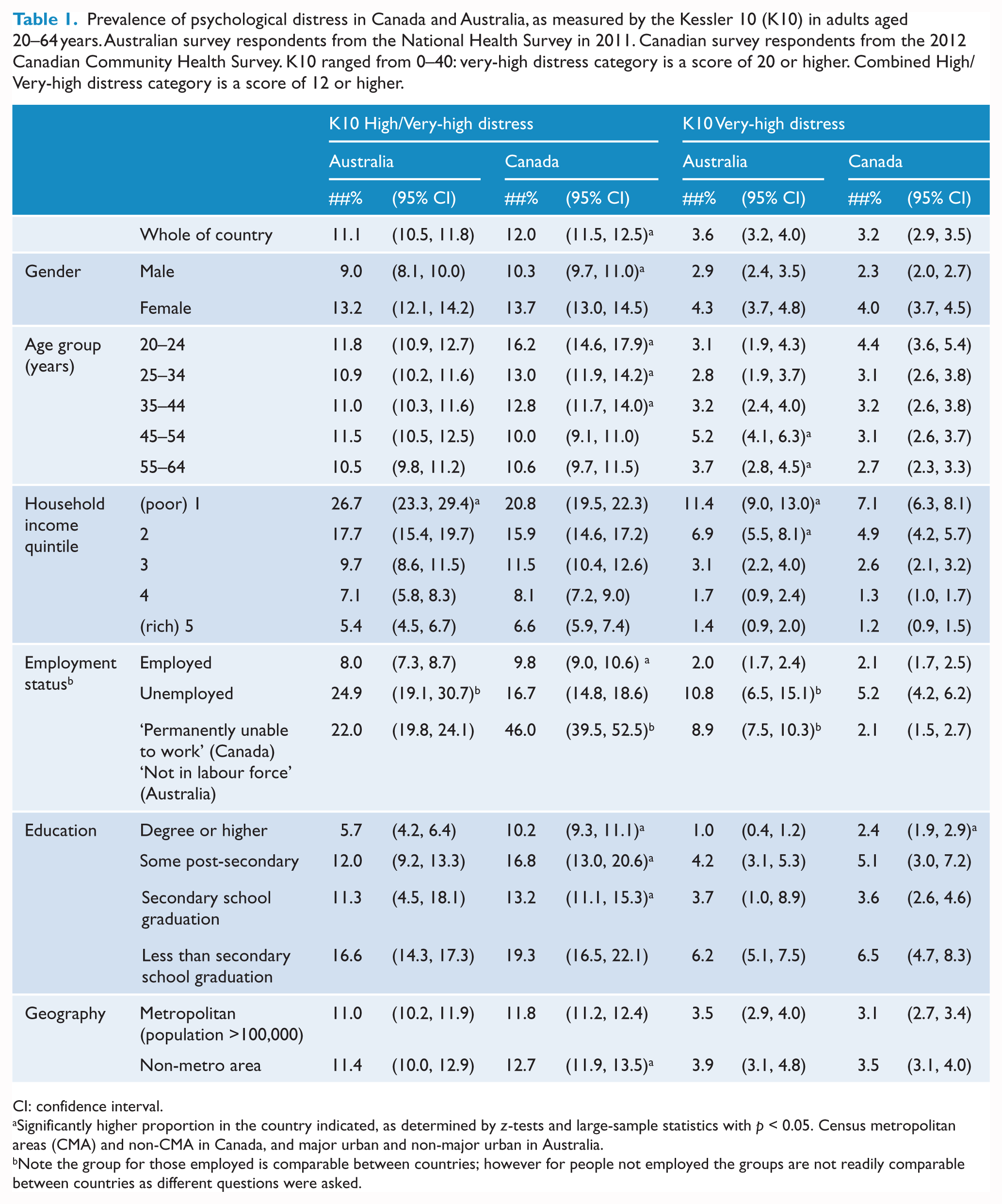 Population-level information on psychological distress was obtained by examining K10 data (Kessler et al., 2002) from the Australian NHS in 2011–2012 (ABS, 2013) and the CCHS on mental health in 2012 (Statistics Canada, 2013).