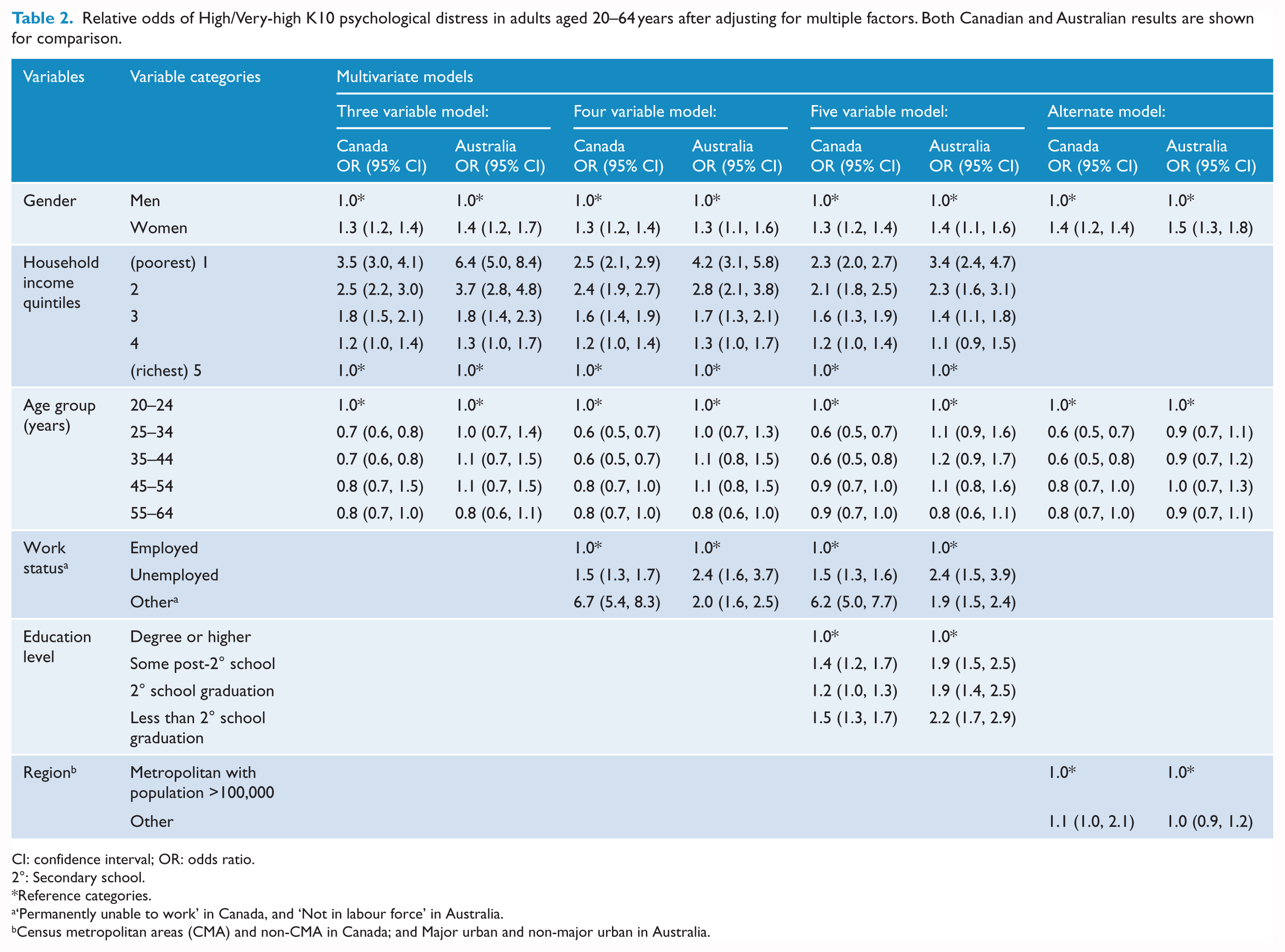 Relative odds of High/Very-high K10 psychological distress in adults aged 20–64 years after adjusting for multiple factors. Both Canadian and Australian results are shown for comparison.
