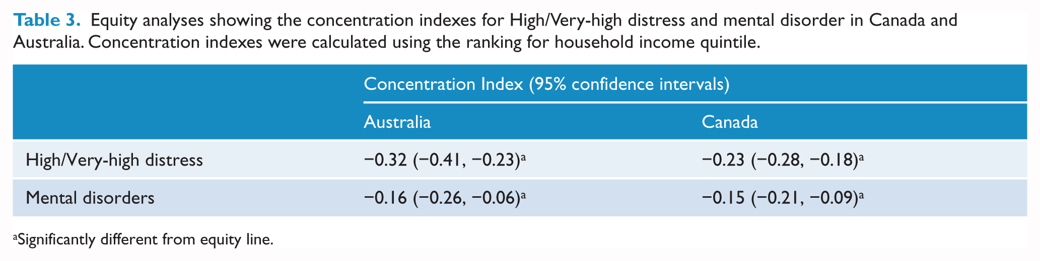 Equity analyses showing the concentration indexes for High/Very-high distress and mental disorder in Canada and Australia. Concentration indexes were calculated using the ranking for household income quintile.