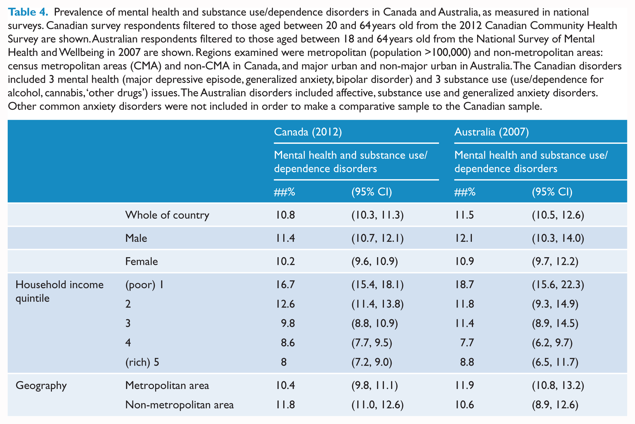 Mental disorder rates were 11.6% (95% CI: [10.5, 12.6]) in Australia and 10.8% (95% CI: [10.3, 11.3]) in Canada. Table 4 shows disorder prevalence was higher in men and those in the lowest household income quintile, which was similar inside and outside metropolitan areas. It may be noted that the confidence intervals for estimates in these Australian analyses are wider than those typically reported from NHS data, and this arises since the NSMHWB was a smaller survey.