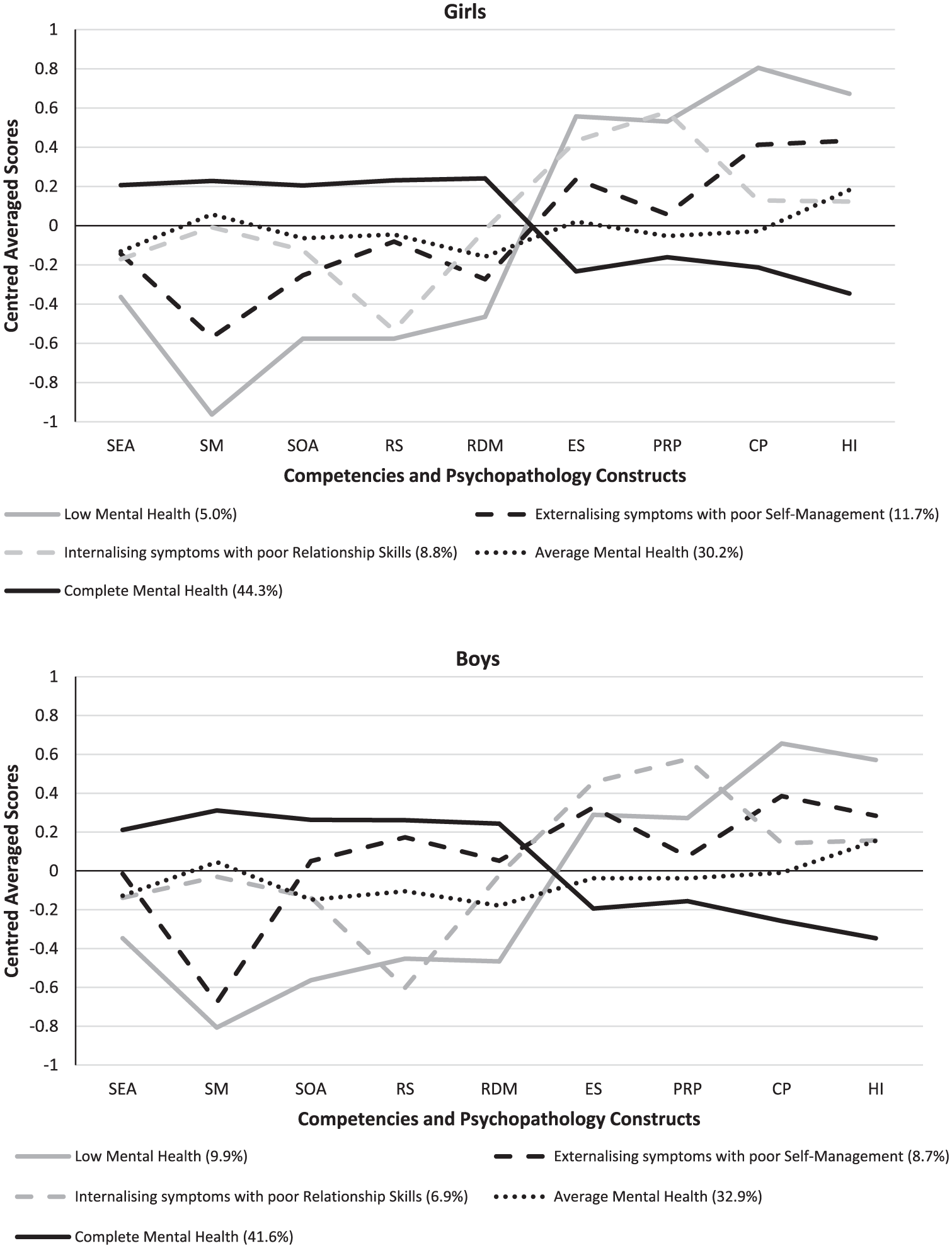 Latent profile analyses of middle childhood (age ~11 years) social-emotional competencies and difficulties yielded a five-profile solution for girls and boys, and these profiles differentially related to health service presentations for mental disorders during adolescence (ages ~12–17 years). Between 42–44% of girls and boys were classified as demonstrating