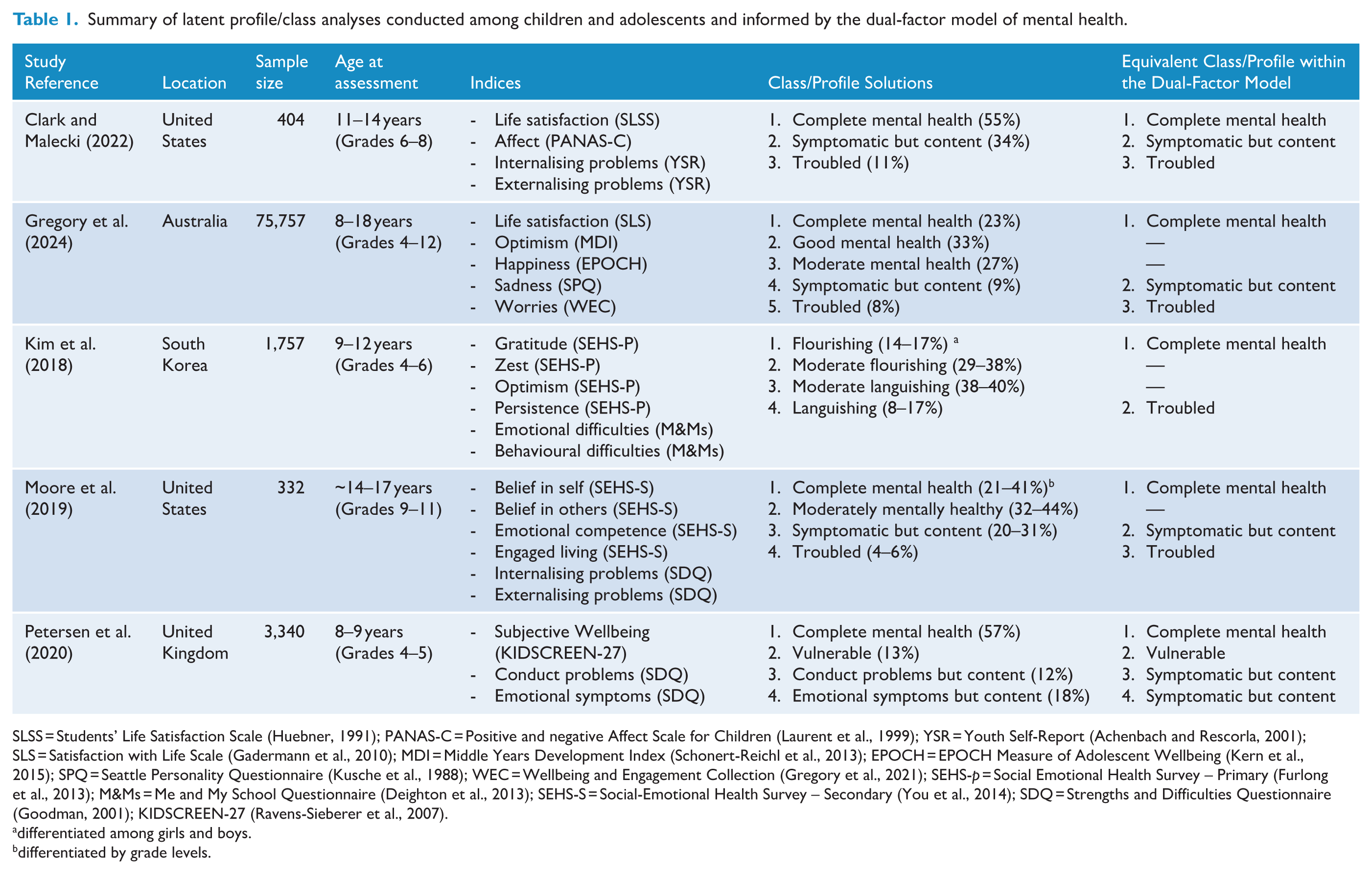 Varying support for the four expressions in the dual-factor model has emerged from these analyses, conducted in child and adolescent community samples across a diversity of social-emotional wellbeing and psychopathology indicators, as summarised in Table 1. Across these studies, differing numbers of profiles emerged, including 3- (Clark and Malecki, 2022), 4- (Kim et al., 2018; Moore et al., 2019; Petersen et al., 2020) and 5-profile (Gregory et al., 2024) solutions. Multiple investigations were unable to detect a ‘