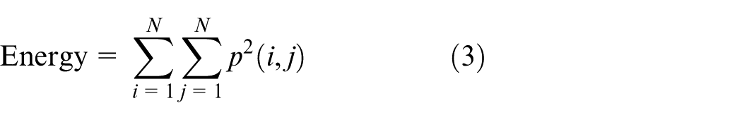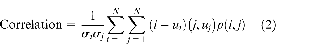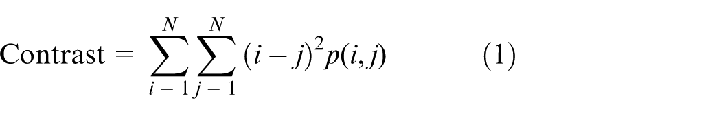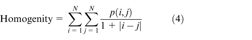 Contrast, correlation, energy, and local homogeneity are calculated as shown in the following formulas