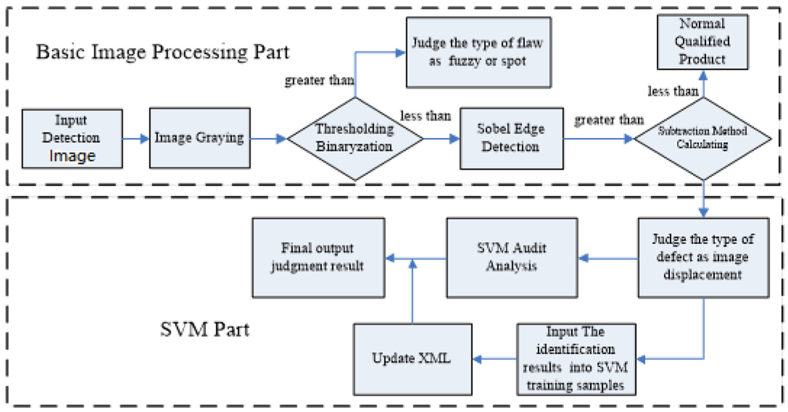 The overall process of defect identification is shown in Figure 1. In the first part, only the basic image processing technology is used without any machine learning algorithm (hereinafter referred to as “traditional image processing”), and the detection image of the input system is “grayscale processing,” which improves the efficiency of the system program and retains most of the original features of the image; the next step is to binarize the image and recognize it according to the set threshold. The remaining images of blurred and speckled defective samples are either “image displacement” or “qualified.” In this system, “Sobel edge detection” 5 and “image subtraction method” 6 are used to calculate the difference threshold between the detected image and template image. If the difference threshold is greater than the predetermined threshold, it is determined as “image displacement,” and if the difference threshold is smaller, it is determined as “qualified product.” At this time, the defect degree of the image can be determined, and the current recognition results can be classified into “SVM training samples.”