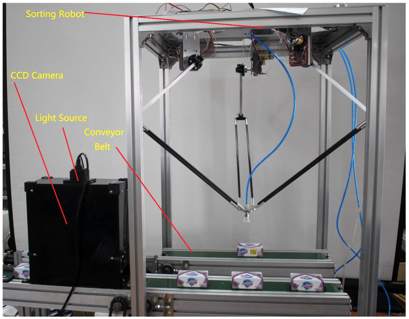 The hardware system consists of an industrial CCD camera, light source, computer, and a sorting robot. CCD is a semiconductor device, the full name is “charge coupled device”, is an image sensor which can convert optical images into digital signals. The CPU of the PC machine uses Intel I5.7500, and the graphics card is GTX1050TI. The CCD camera is a signal collecting unit; the resolution is 1600 × 1200, and the image frames per second is 52 fps. The shortest exposure time is 20 µs. The light source illuminates the printed matter so that the CCD camera can get the best image signal.