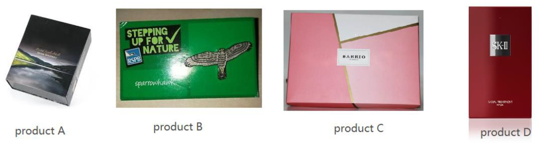 In order to verify the feature adaptation of SVM, our team conducted a different set of experiments. We selected six common boxes in the market to identify defects. They are Products A, B, C, and D, as shown in Figure 7.