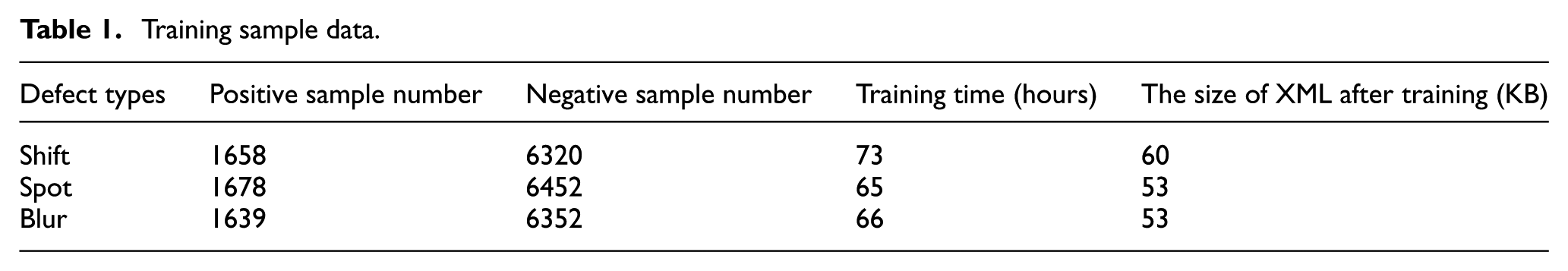 In order to construct the SVM training model, the specific data in Table 1, our team was trained in the acquisition of nearly 12,000 images in real production, including about 4800 defect image, image shift, spots, each blur defect type 1600, detection of qualified products 19,124 images. The training time is 204 h.