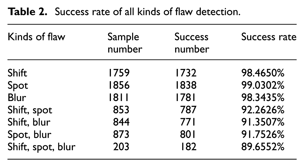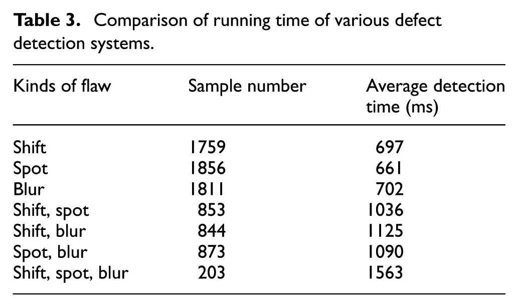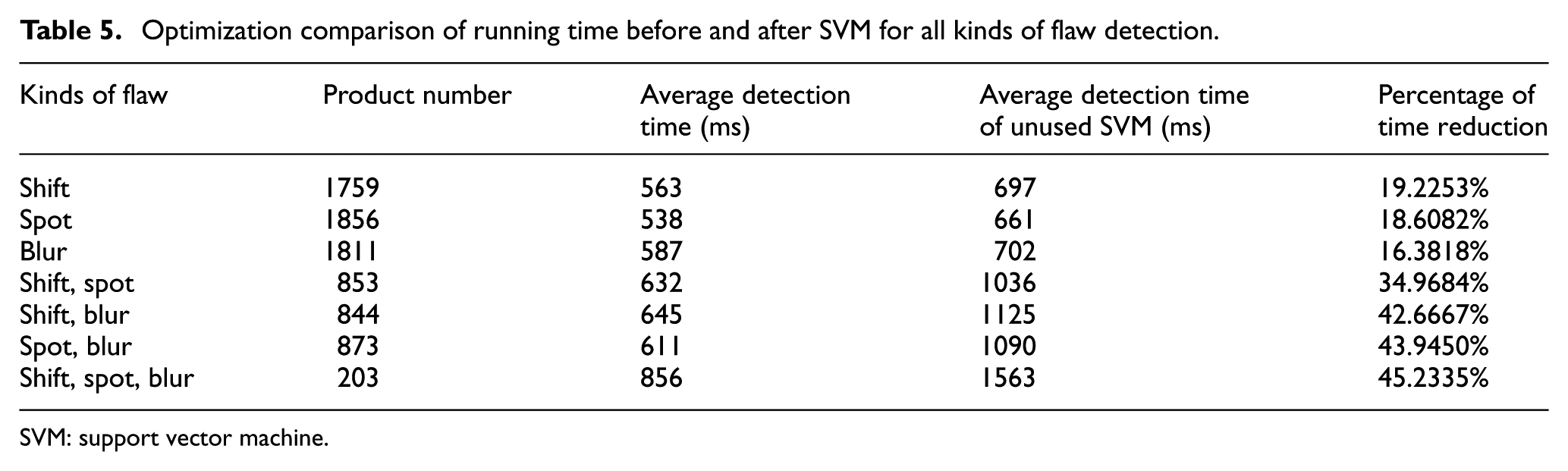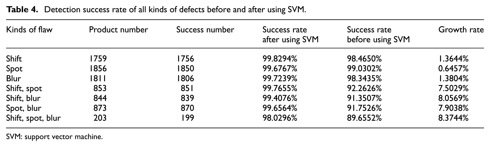 Many experiments without SVM were done. In this experiment, the samples exceeded 8100 product images, including six possible combinations of defects. As shown in Table 2, as the type of defect increased, success drops from 98% to 92%, and finally down to 89%. In addition, the time of detection and recognition increased with the improvement of the complexity of the defect, as shown in Table 3.