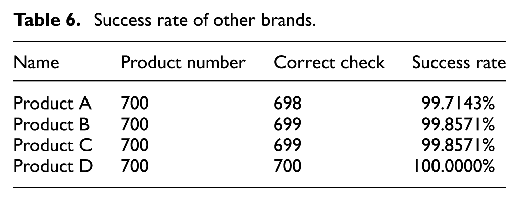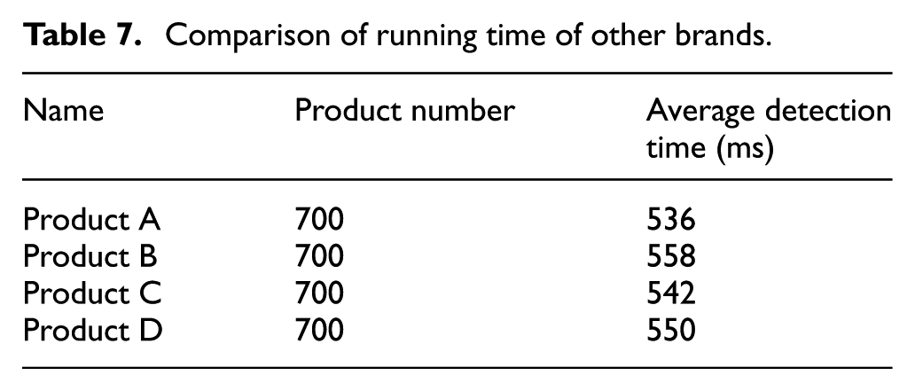 The defect feature model obtained from the previous experiments is used to identify the packaging boxes of other products. Experiments show that the feature model has been able to identify three kinds of surface defects: shift, spot, and blur. The experimental data are shown in Table 6, and the running time is shown in Table 7. Experiments show that machine learning is feasible for detecting defects in packaging boxes. As long as the number of training samples is guaranteed, computer learning can adapt to similar defects of different products.
