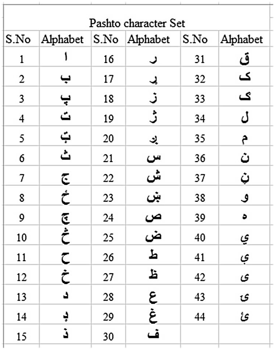After accumulating all these characters, the Pashto language has a total of 44 characters in its dataset that is shown in Figure 1.