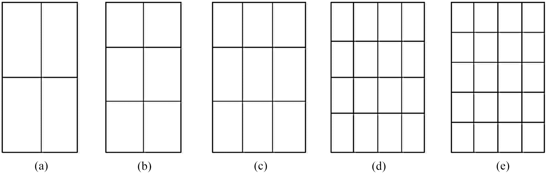 Uniform zoning grids of 2 × 2, 3 × 2, 3 × 3, 4 × 4, and 5 × 4 sizes respectively.