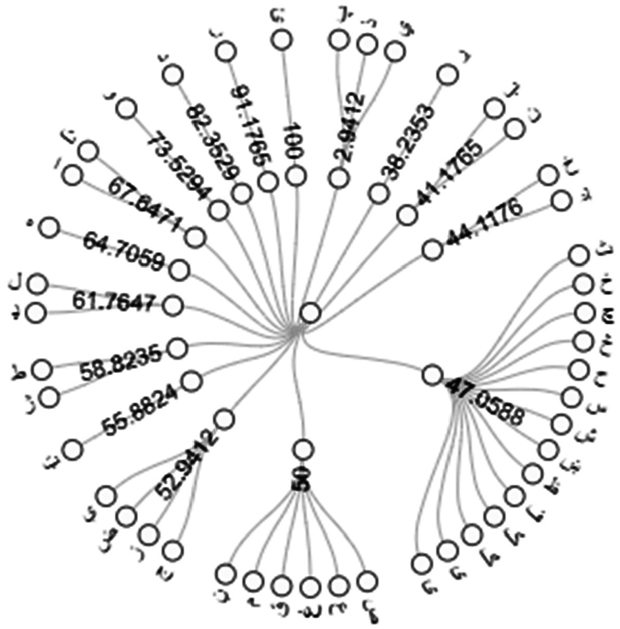 In Figure 14 the end-nodes represents the Pashto characters and the nodes at the middle represents the accuracies for the corresponding letters. It is concluded from the Figure 14 that slight change in character’s shape confuses the classifier in recognizing the characters accurately. While multi-class problem is another big barrier to the SVM model, as the Pashto language consists of 44 characters (44 different classes).