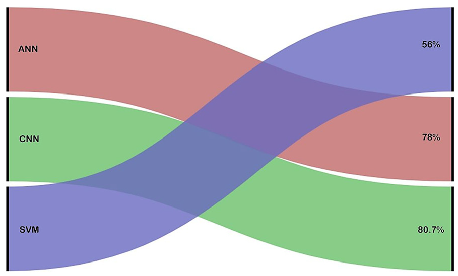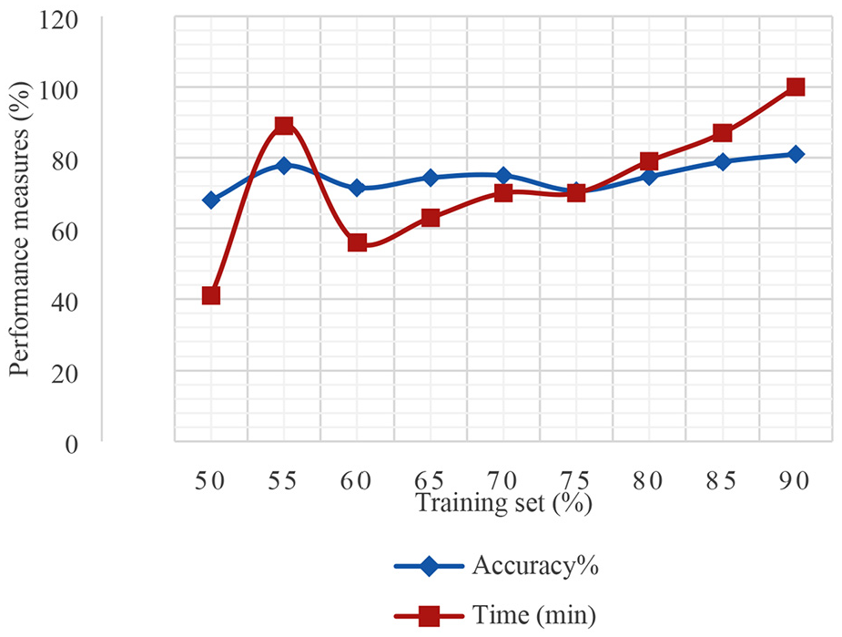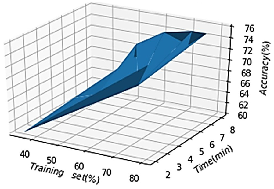 After examining the results of each model (SVM, ANN, and CNN), the convolution neural network achieves prominent recognition results. The proposed CNN model is also tested for varying training sets and test sets and generated different time and accuracy charts based on these training and test sets. The results are depicted in Figure 20.