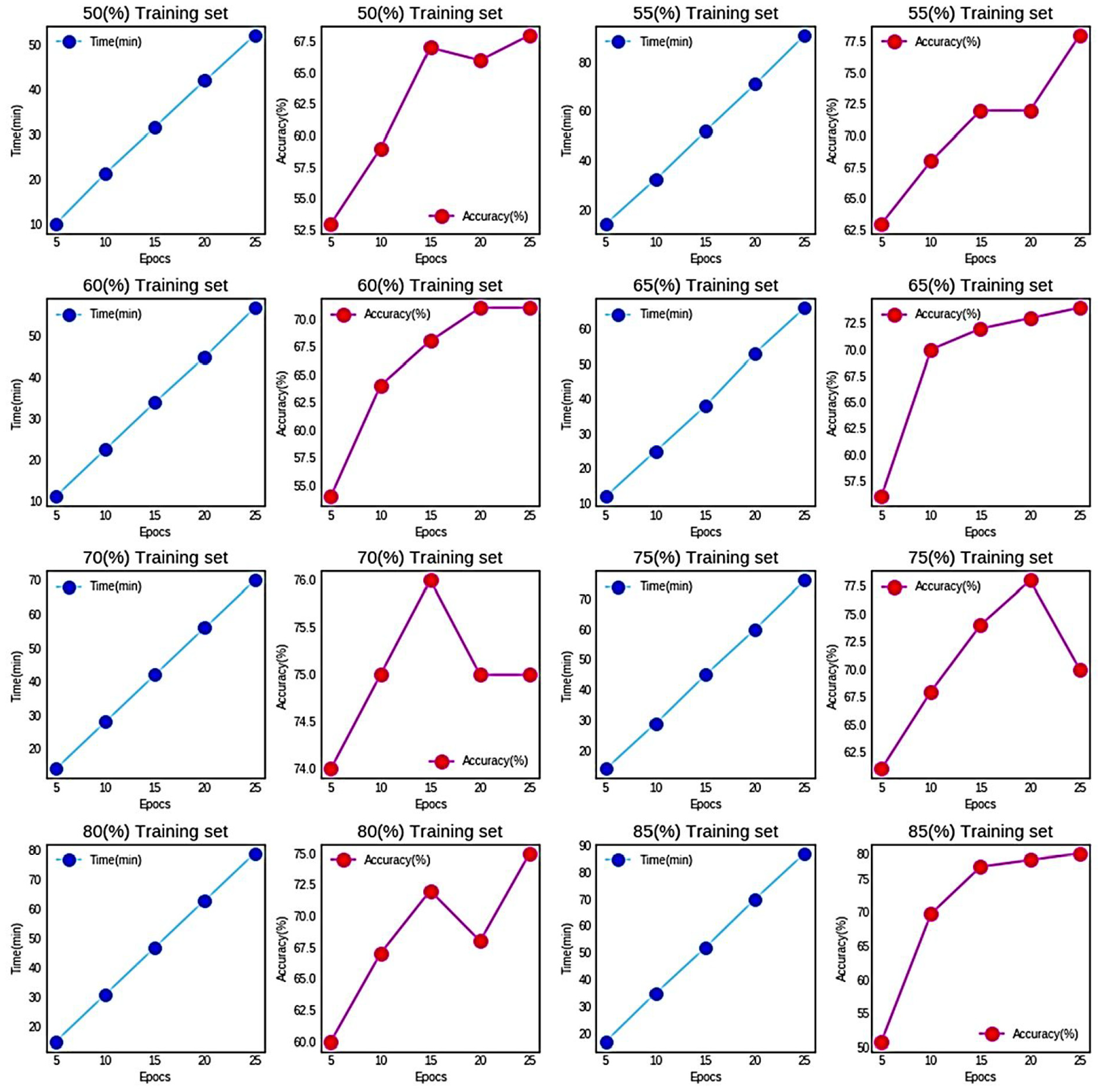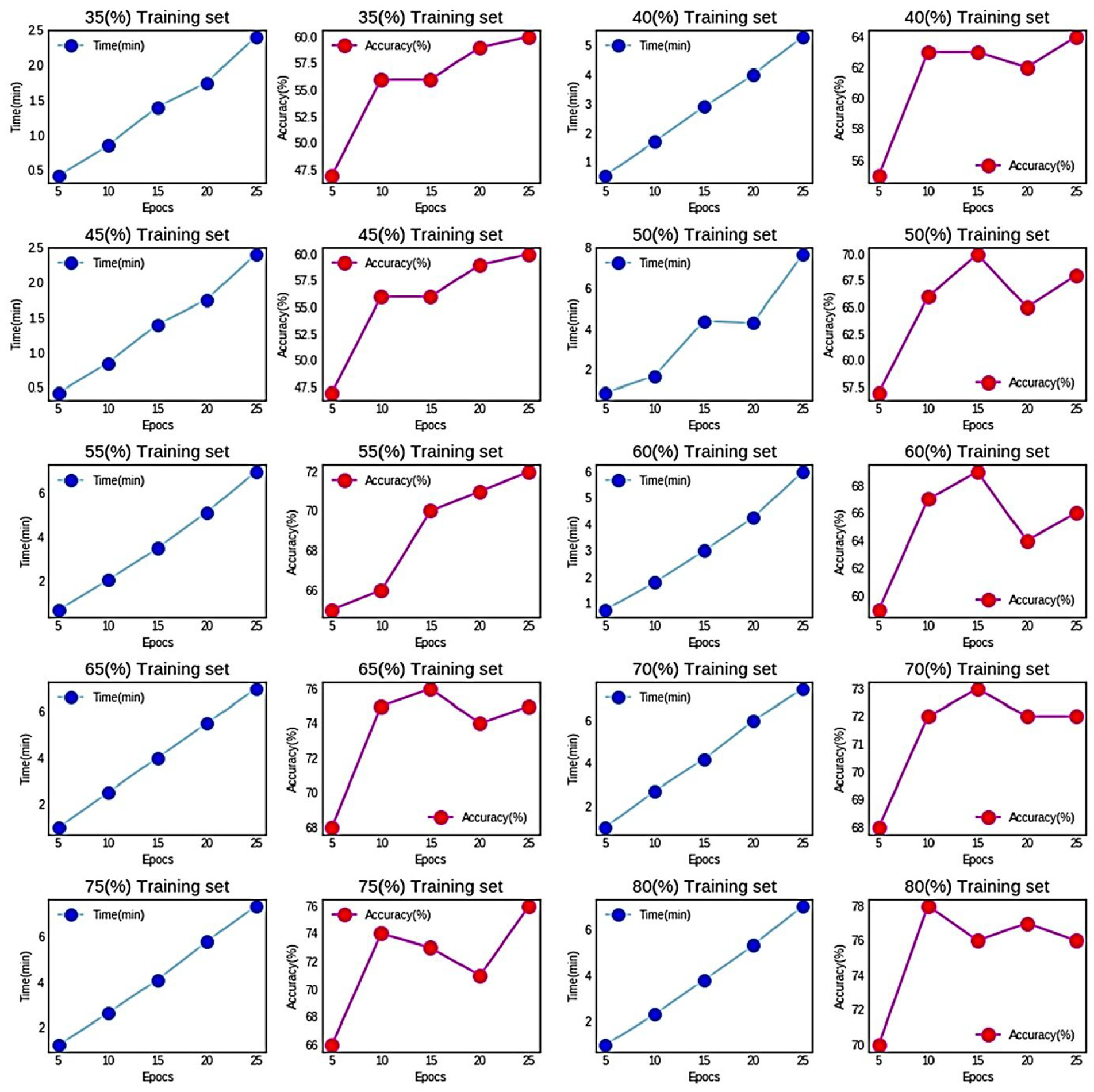 The time consumed and accuracy measured graph for varying training and test sets based on epoch size.