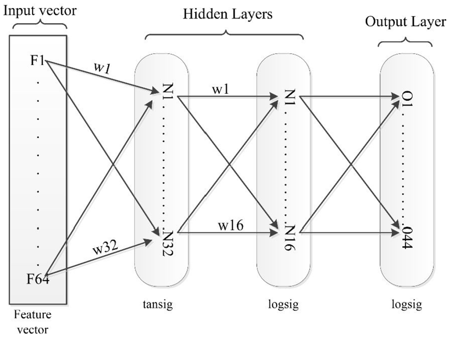 Artificial Neural Network works by predicting the results from the set of input variables. Inspired from the human brain where many neurons pass information to each other to perform certain pattern matching and recognition task efficiently and accurately the idea of ANN is developed. Due to the high classification and recognition abilities, ANN is exploited in the field of handwritten characters recognition. 29 In their study, the features based on diagonals are extracted which are then used by ANN for recognition of handwritten alphabets. ANN is also used for solving quantum many-body problems. 30 Feed forward Neural Network is presented by Zhao et al. 31 for the recognition of characters via surface mount technology (SMT) products. The efficiency of SMT is further enhanced by introducing the additional back propagation algorithm in the approach. The approach exploits momentum item for that results in avoiding oscillations, divergences and convergence is also improved. In the proposed research work a back propagation neural network is used consists of an input layer, two hidden layers, and an output layer as shown in Figure 3.