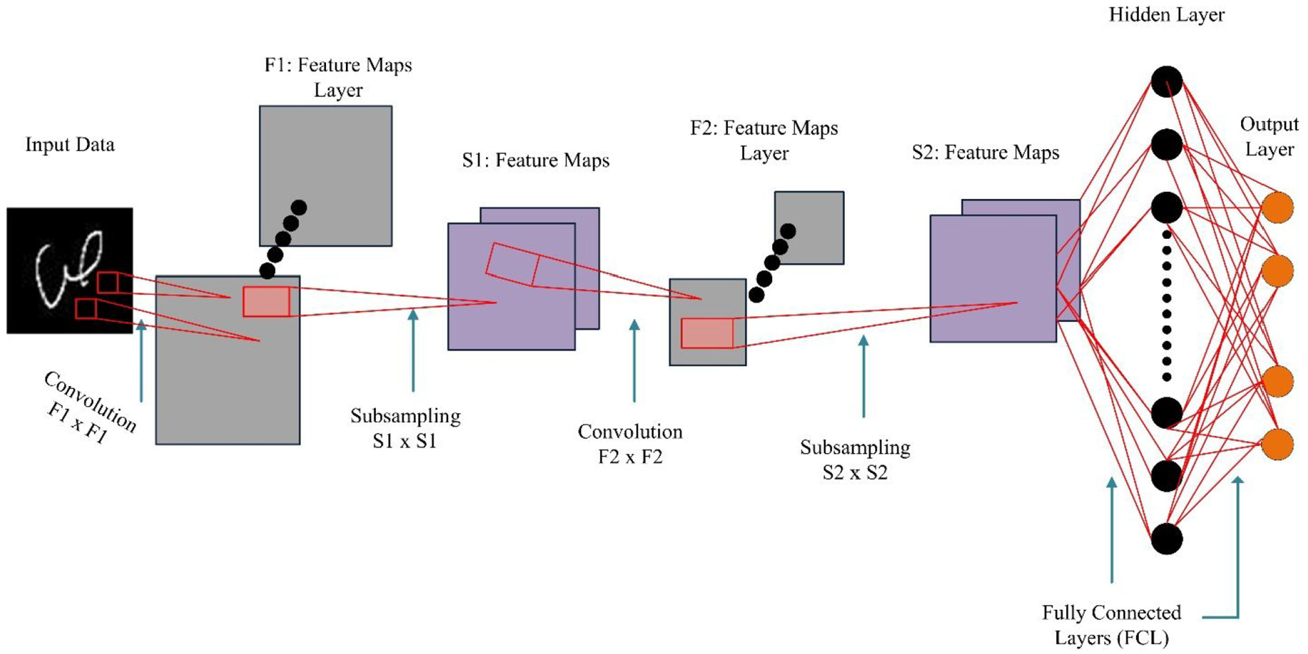 As a result of having multi-layered and hierarchical neural network training via back-propagation procedure using architecture of deep supervised learning, Convolution Neural Network (CNN) has an automatic feature extraction capability as well as work as classifier. Main aim of the CNN is to work in the situation where we have more complex and data with many dimensional. CNN differs from other learning algorithms due to investigation of convolution layers and sub-sampling is performed. Due to the variations that occur in shapes, CNN are used for classification and recognition of objects, handwritten digits, 32 as well as to recognize Urdu Nasta’liq.33,34 CNN is usually used for the problems associated to pattern recognition to get the efficient performance. CNN is based on three main steps which is performed in hierarchy such as weight sharing, spatial, and subsampling to insure the invariance to distortion, shift, and scale respectively. Model of the CNN for recognition of Pashto handwritten recognition is shown in Figure 4. In the first step, filters (F hidden layers) are applied on the input data which convolved the data for the object to get feature map values. For the reduction of dimensionality such as S hidden layer of features map’s spatial resolution, convolution layers that are obtained from the previous step and then engaged with the help of sub-sampling layer. Furthermore, convolution layer trigger the feature-extractor to get or retrieve features by altering the sub-sample layers. Further these layers get engaged by layers such as output and two fully connected layers (FCL). Subsequently, the output from the previous layer is accepted as an input by each subsequent layer.