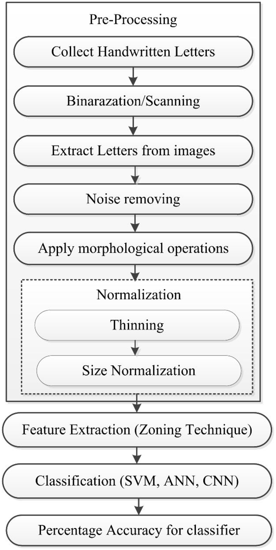 Framework designed for the recognition of Pashto character is achieved through implementing in using three major steps or phases that is shown in Figure 5.