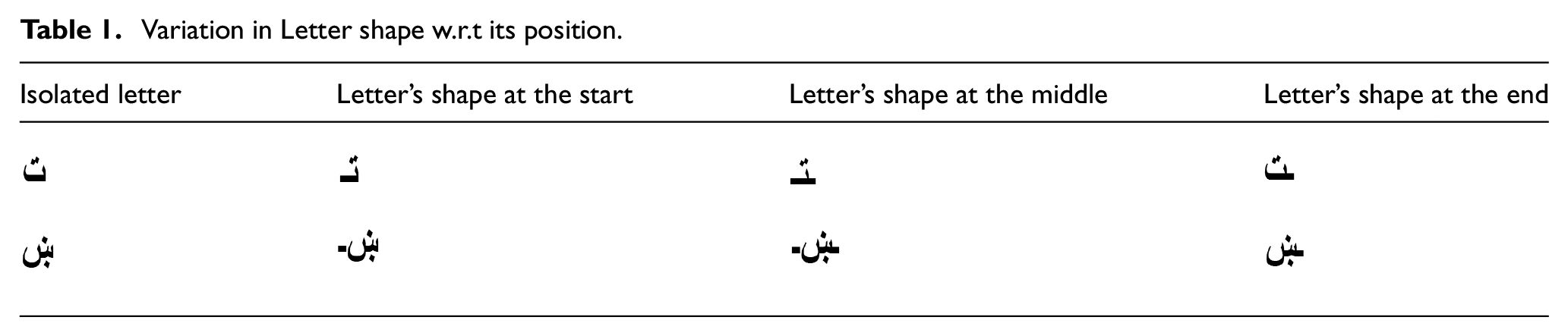 Pashto is derived from Perso-Arabic characters as a modified pattern of it. Pashto writing can be done in a version of Persian script that is a derivation from the Arabic script as well. There are a total of 44 characters in the Pashto language as shown in Figure 1. For written Pashto script, several characters can be merged to make a word as well as a combined character. Furthermore, according to the position of a word, the shape of the character change as well. Due to some variations in character’s shape during the formation of the word make it more challenging as the shape of the character varies to its appearance in the word. For example shape of a character appearing at the start of a word is different if the same character appears in the middle or at the end of the word as shown in Table 1.