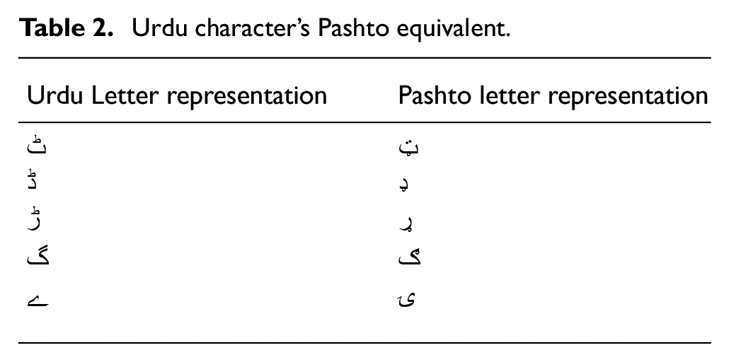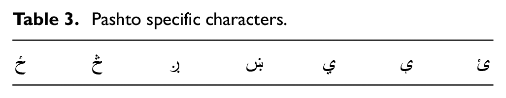 Seven characters that are specific to the Pashto language are shown in Table 3.
