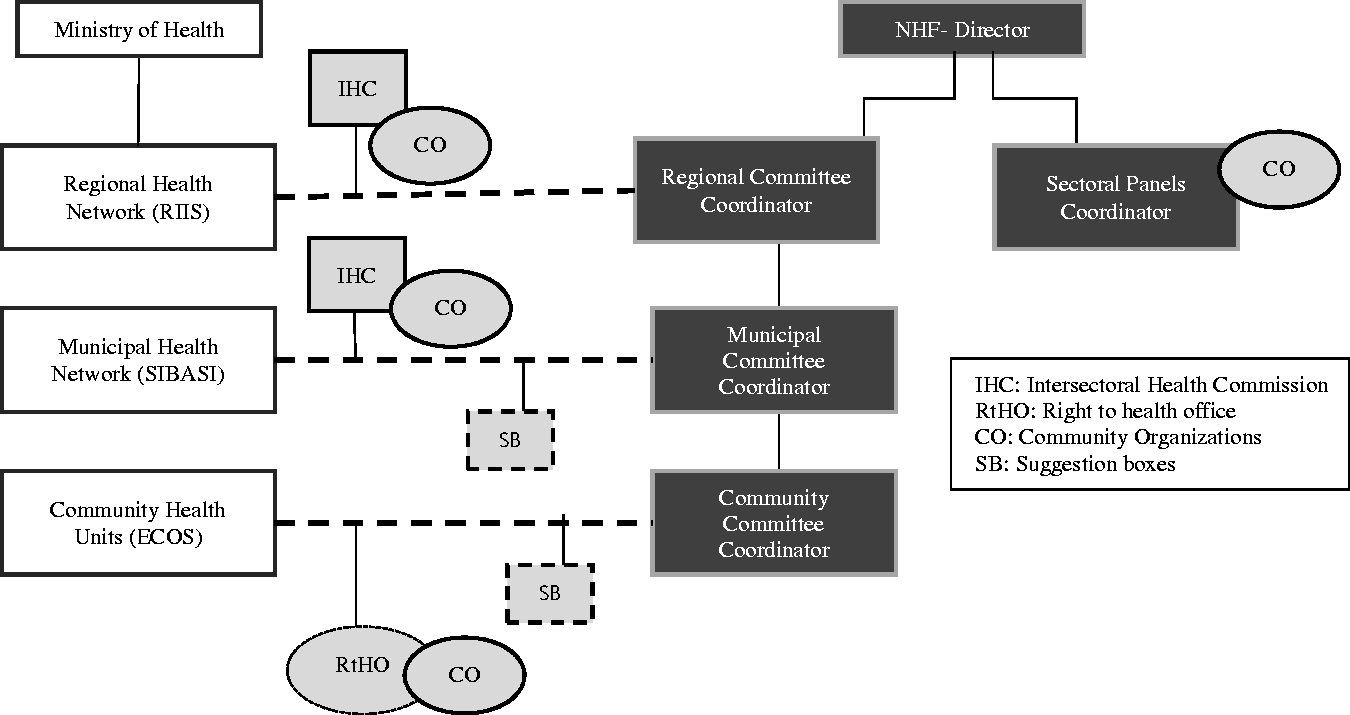 Community level: Both the MoH and NHF have committees where strategic actions are developed to respond to community needs. At this level and within each community health unit are “right to health offices,” where both institutions engage along with other stakeholders such community organizations and civil societies. The main function of this offices is to address accountability issues such as shortage of medication, quality of care, and human rights. At this level are also “suggestion boxes” where civilians can express their claims. Municipal level: This level includes hospitals (second and third level) where they meet monthly at the Intersectoral Health Commission (IHC) with other stakeholders, such as the NHF and community organizations. Issues discussed include coordination with the other levels of decision making, implementation of strategic plans, the comprehensive epidemiological vigilance, and compliance with certain statements such as the participatory law. Suggestion boxes have been placed at health structures at this level. Regional level: 4 regional health structures are represented at each of the 4 regions of the country. At the IHC matters discussed at lower levels of decision making are addressed and used to inform policymaking. National level: The Ministry of Health is divided in 2 departments: Vice-Ministry of Health Policies and Vice-Ministry of Health Services. The Vice-Ministry of Health Policies ensure that policy formulation with different stakeholders is being developed and the NHF has a role of “social comptrollership” so that policies are issued with a human right basis.”