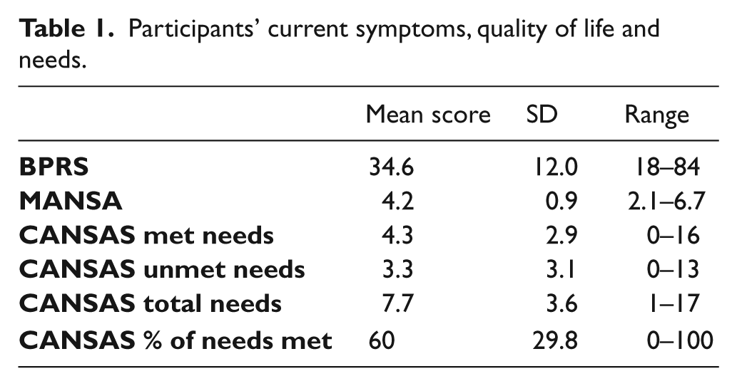 One participant failed to complete the questionnaires and their data were excluded from further analysis. Descriptive statistics of the remaining 66 participants’ scores on the MANSA, BPRS and CANSAS are shown in Table 1.