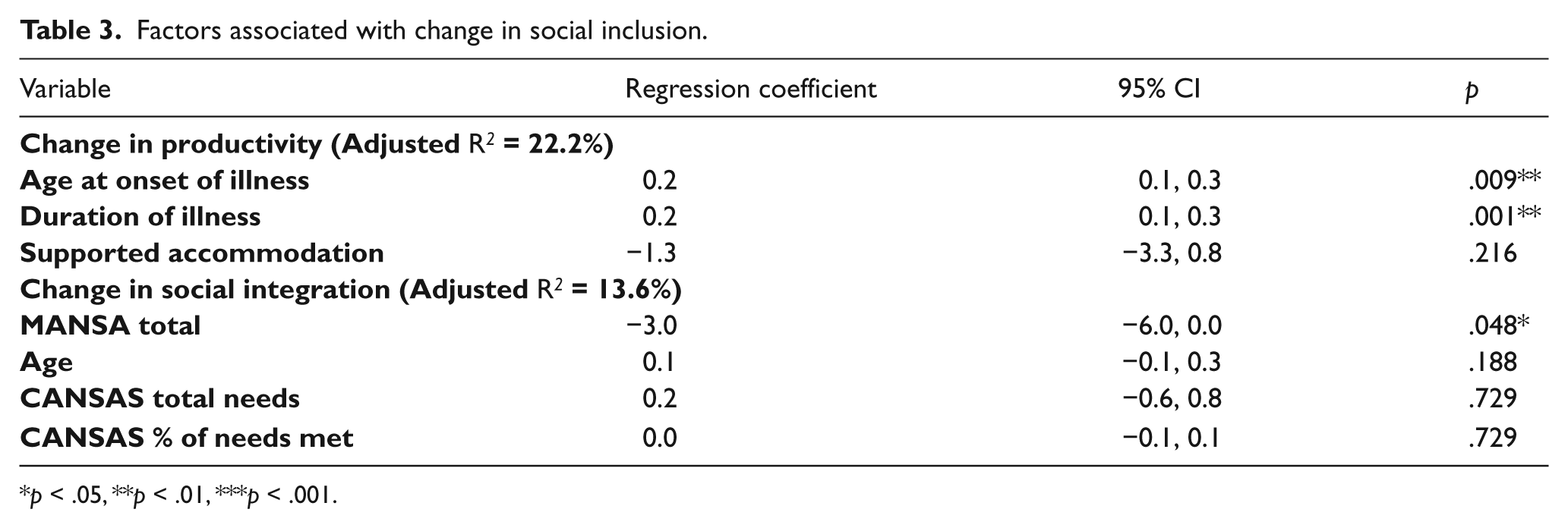 Using Dunlap, Xin & Myers (2004), it was calculated that with a sample size of 66 patients there would be 80% power to estimate the relationship of four factors of a medium effect size of 0.41 with change in social inclusion at a 5% significance level.
