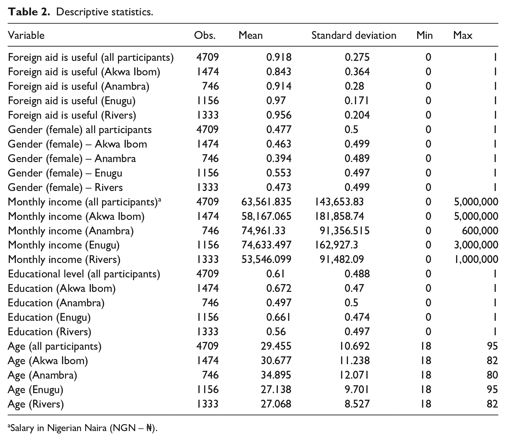 Gender is a very important attribute to study. Most of the studies on foreign aid did not consider the unique experiences of women while formulating their theoretical stance. For instance, women generally experience a lower socioeconomic condition than men (Girón and Kazemikhasragh, 2022). The study by Handrahan (2004), Manjoo and McRaith (2011) and Greenberg and Zuckerman (2009) also show that women are usually discriminated against in aid allocation processes, and policies made to address conflict disfavour women. In other words, the opinions of women are crucial for development initiatives, especially those that influence their wellbeing. The current realities and studies on the socioeconomic conditions of women indicate that the perception of women on foreign aid may be geared towards Sachs’ perspective: foreign aid positively enhances development in recipient countries, especially by addressing unfavourable socioeconomic and internal factors. In other words, while the effectiveness of foreign aid is conditional, it is expected that women may have a more favourable perception of foreign aid than men, as women generally have lower socioeconomic status than men in most societies and in Nigeria. Older people also tend to have more income, access to funds and better socioeconomic status than younger people; although this could be contested, nevertheless, it is an important individual attribute to examine/control (Table 2).