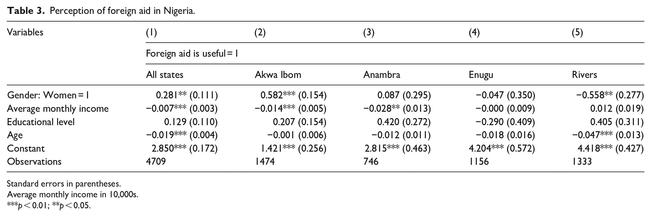 The results in Table 3 show that the arguments on aid effectiveness will remain contestable. The clear pattern is that people with lower socioeconomic status such as women, lower income earners, and younger people are more optimistic about the impacts of aid than people with higher socioeconomic status. However, this is not applicable across all the states. Some states have either insignificant or at worst contrasting opinions. For instance, the general trend shows that women are more optimistic about the impacts of foreign aid than men. This is equally the case in Akwa Ibom State. Nevertheless, there is no significant difference between the perceptions of women and men in Anambra and Enugu State. Most importantly, women in Rivers State are more pessimistic about the usefulness of aid than men in Rivers State. These could strongly reflect the experiences of women with aid in the state.