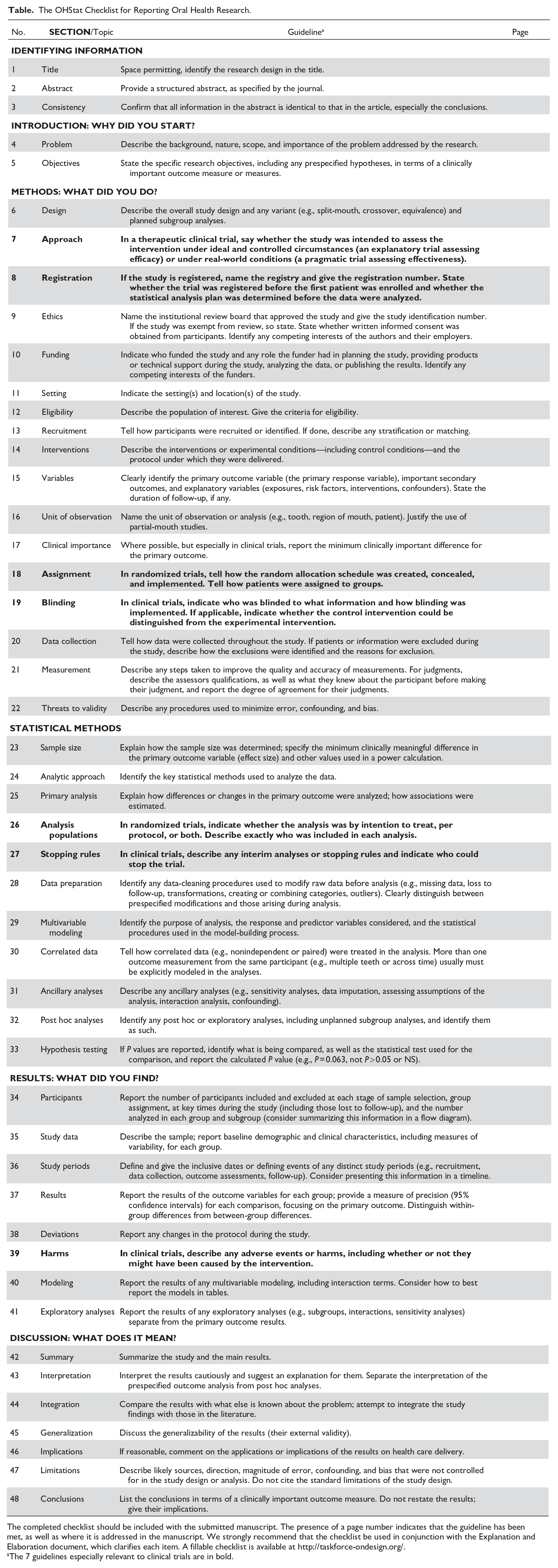 The OHStat checklist is recommended for reporting key aspects of most observational studies and clinical trials in oral health. The 48 guidelines were formulated for authors, reviewers, and journal editors to improve reporting of observational studies and clinical trials (both randomized and nonrandomized trials) involving human participants evaluating an oral health–related biomedical or behavioral outcome (U.S. National Institutes of Health 2014). Many of the 48 OHStat guidelines are more focused or homogeneous, which increases the number of items but makes it easier to determine whether an individual guideline has been addressed. In contrast, the 25 CONSORT guidelines are more heterogeneous; they actually ask authors to respond to 53 questions. The same is true of the 22 Strengthening the Reporting of Observational Studies in Epidemiology (STROBE) guidelines, which ask 33 questions.