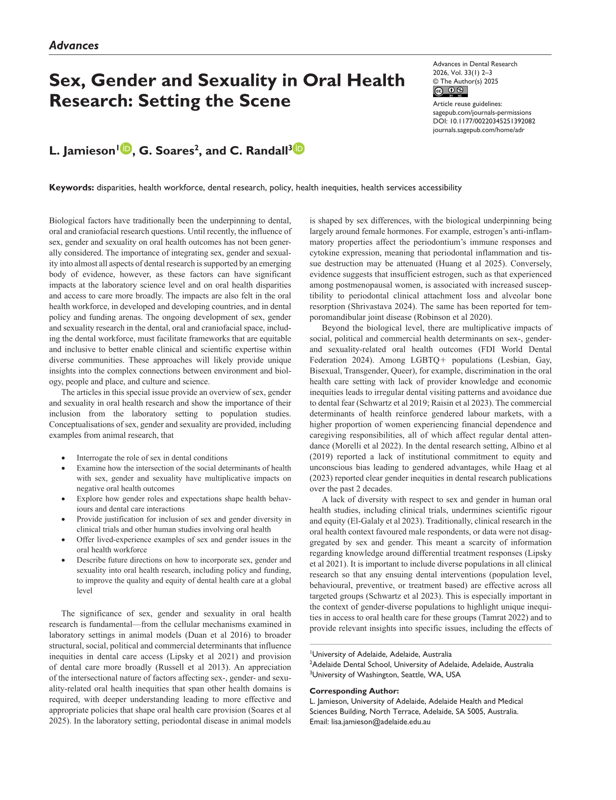 The significance of sex, gender and sexuality in oral health research is fundamental—from the cellular mechanisms examined in laboratory settings in animal models (Duan et al 2016) to broader structural, social, political and commercial determinants that influence inequities in dental care access (Lipsky et al 2021) and provision of dental care more broadly (Russell et al 2013). An appreciation of the intersectional nature of factors affecting sex-, gender- and sexuality-related oral health inequities that span other health domains is required, with deeper understanding leading to more effective and appropriate policies that shape oral health care provision (Soares et al 2025). In the laboratory setting, periodontal disease in animal models is shaped by sex differences, with the biological underpinning being largely around female hormones. For example, estrogen’s anti-inflammatory properties affect the periodontium’s immune responses and cytokine expression, meaning that periodontal inflammation and tissue destruction may be attenuated (Huang et al 2025). Conversely, evidence suggests that insufficient estrogen, such as that experienced among postmenopausal women, is associated with increased susceptibility to periodontal clinical attachment loss and alveolar bone resorption (Shrivastava 2024). The same has been reported for temporomandibular joint disease (Robinson et al 2020).