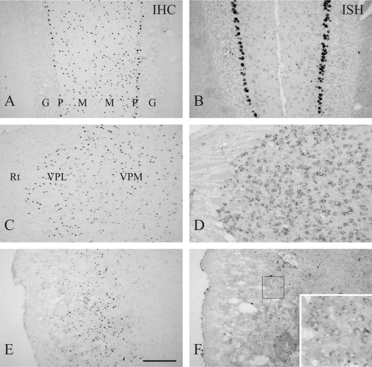 aSemiquantitative estimates of the signal are indicated: + + + +, very strong; + + +, strong; ++, moderate; +, weak; ±, equivocal; −, negative. ISH, in situ hybridization; IHC, immunohistochemistry; MD, mediodorsal thalamic nucleus; VPM, ventral posteromedial thalamic nucleus; VPL, ventral posteromedial thalamic nucleus; VM, ventromedial thalamic nucleus; VL, ventrolateral thalamic nucleus; LD, laterodorsal thalamic nucleus; LP, lateral posterior thalamic nucleus; Rt, reticular thalamic nucleus; DLG, dorsal lateral geniculate nucleus; MG, medial geniculate nucleus; SCN, suprachiasmatic nucleus; PVN, paraventricular nucleus; MMN, medial mammillary nucleus; LA, lateral amygdaloid nucleus; BLA, basolateral amygdaloid nucleus; MA, medial amygdaloid nucleus.