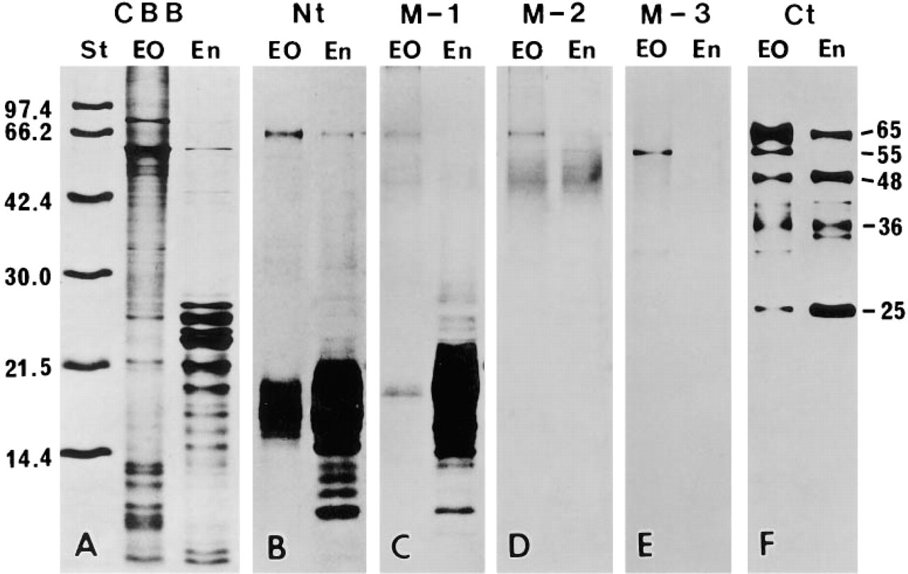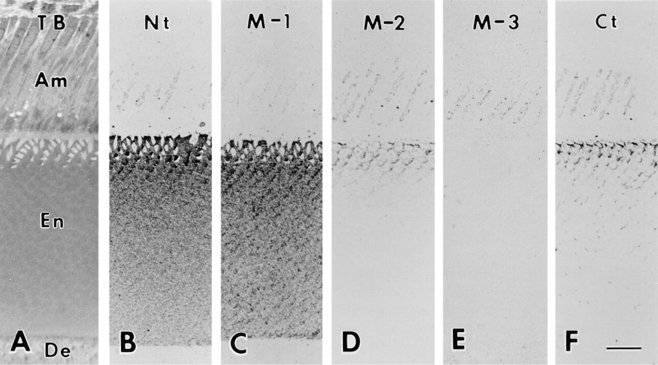 Figure 1 shows the results of SDS-PAGE and Western blot analysis. There was almost no variation among the four animals used in this study. In the enamel organ sample, antibody Nt reacted with protein bands having molecular weights of 65 kD and 15 to 18 kD, and a faint band near 55 kD. In the enamel matrix sample, the 65-kD protein band stained weakly, and proteins ranging from 10 to 22 kD stained intensely. No reaction was observed near 55 kD (Figure 1B). Antibody M-1 stained many protein bands ranging from 10 kD to 23 kD in the enamel matrix and a single protein band near 18 kD in the enamel organ. The 65-kD and 55-kD protein bands were scarcely discernible in the enamel organ sample and not at all in the enamel matrix sample (Figure 1C). Several faintly stained protein bands ranging from 23 to 50 kD appeared after staining with antibodies Nt and M-1, especially in the enamel matrix sample (Figures 1B and 1C). Electrophoresis using a freshly prepared sample showed that almost no band was found between 23–50 kD. Therefore, the proteins ranging from 23 to 50 kD stained by the antibodies Nt and M-1 were probably aggregates of lower molecular weight proteins. Antibody M-2 faintly reacted with a protein band near 65 kD and a diffuse band around 40–56 kD of the enamel organ. In the enamel matrix sample the 65-kD protein band was not detected, but a diffuse band around 40–56 kD was observed (Figure 1D). Antibody M-3 stained a protein band near 55 kD distinctly and 33 kD faintly from the enamel organ. No staining band was found in the enamel matrix (Figure 1E). Antibody Ct stained protein bands near 65 kD, 55 kD, 48 kD, 41 kD, 36 kD, 35 kD, 33 kD, and 25 kD of the enamel organ. In the enamel matrix, a similar staining pattern was obtained. However, no band was detected near 55 kD and 33 kD and the immunoreaction of the 65-kD protein band was reduced, whereas that of the 25-kD protein was intensified (Figure 1E). The 57-kD protein band, corresponding to rat serum albumin under non-reducing conditions, was distinct in the enamel organ and the enamel sample after staining with CBB (Figure 1A), but was not reactive with all the antibodies used (Figure 1B-1F). Only antibody M-2 faintly stained a protein band near 56 kD. However, comparing the staining patterns after CBB and M-2, it was clear that the 56-kD protein band stained by the antibody M-2 did not correspond to rat serum albumin (Figures 1A and 1D).