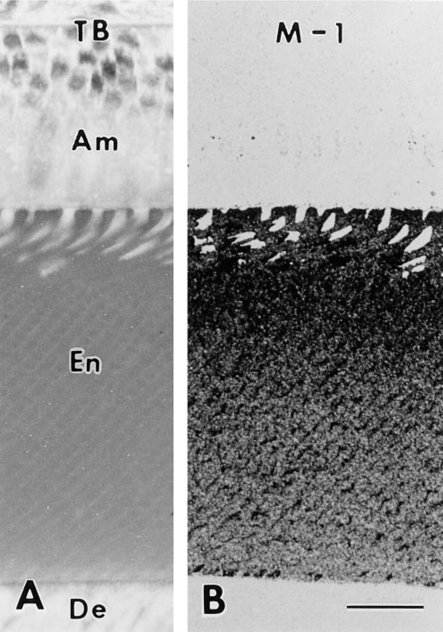 Light micrographs of secretory ameloblast (Am), immature enamel (En), and dentin (De) at the stage of outer enamel secretion from longitudinal sections of a rat incisor. (
